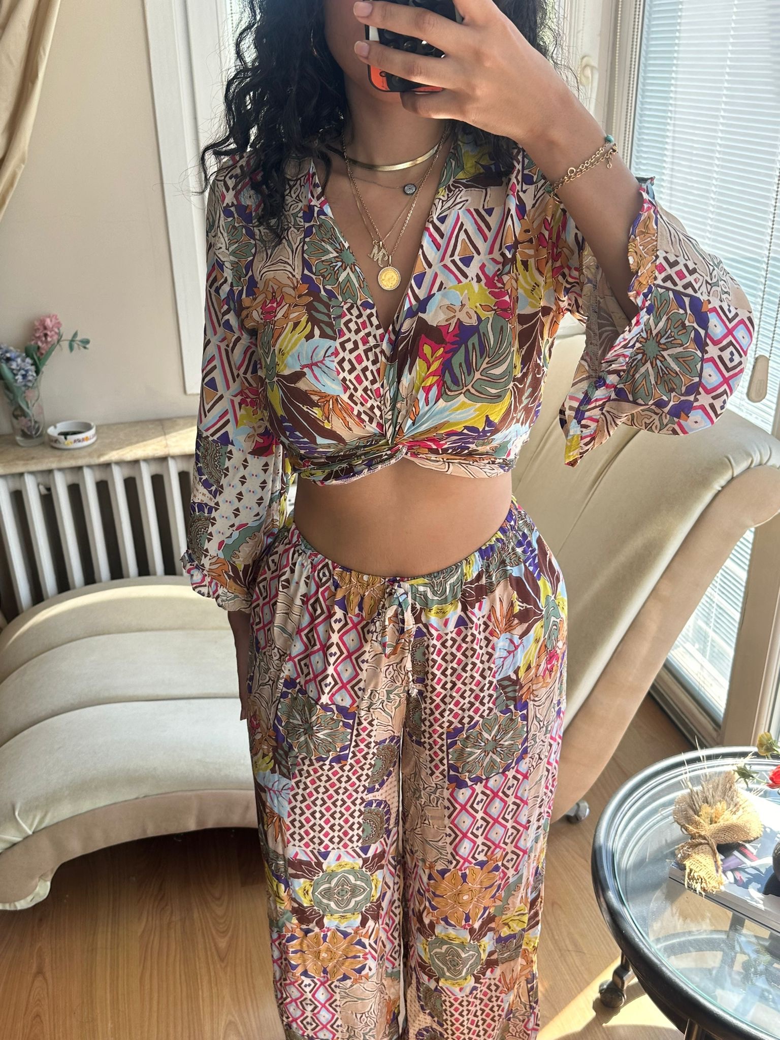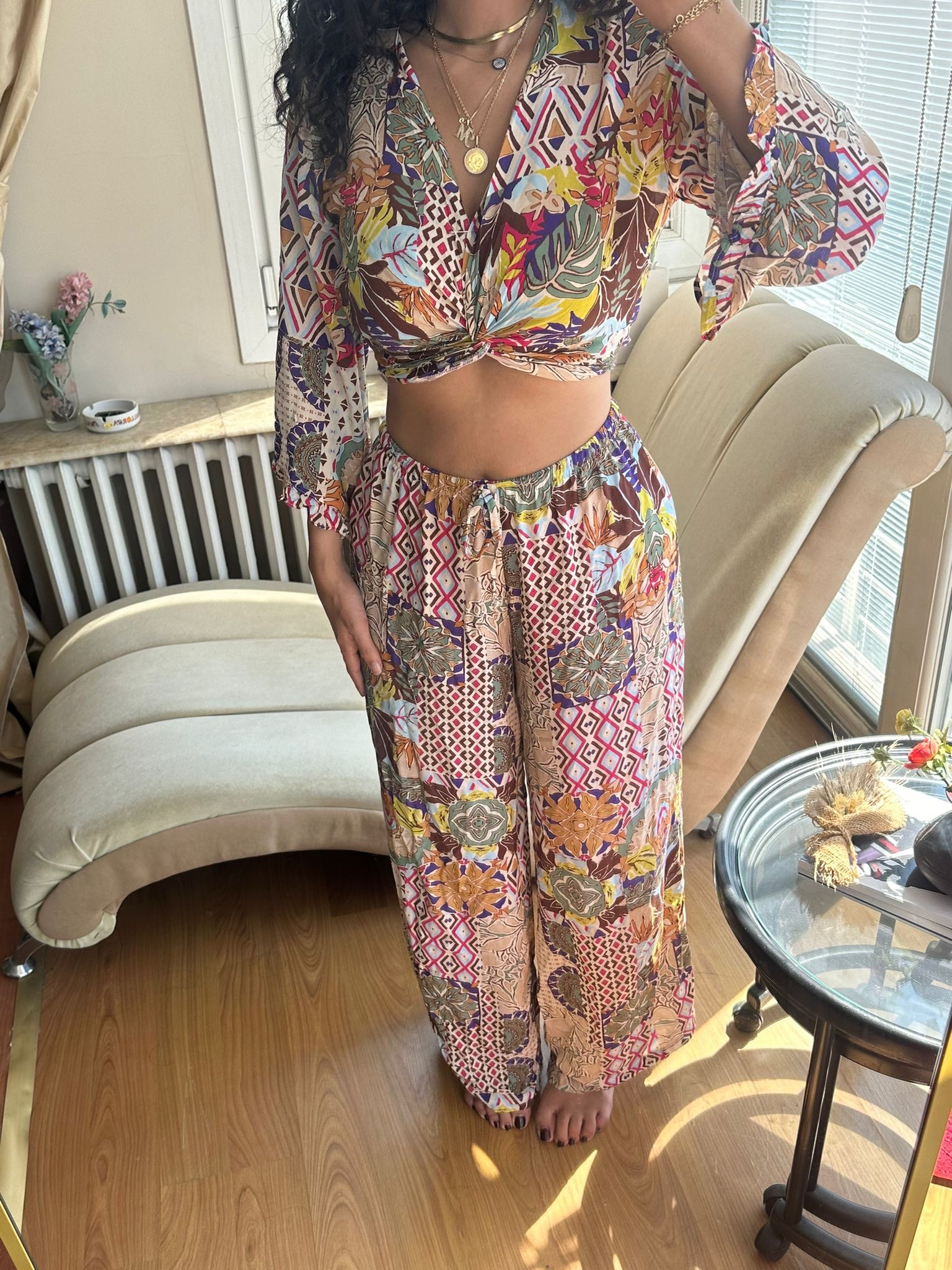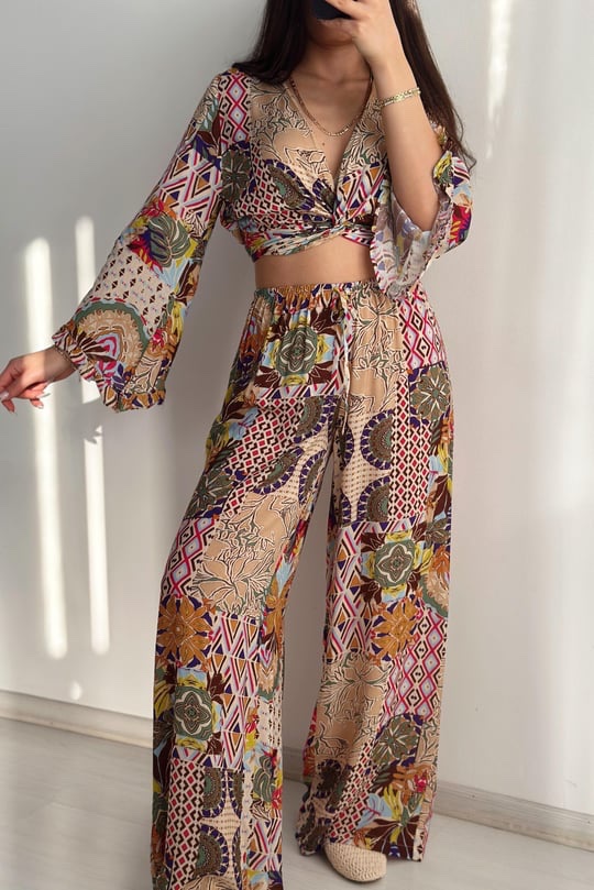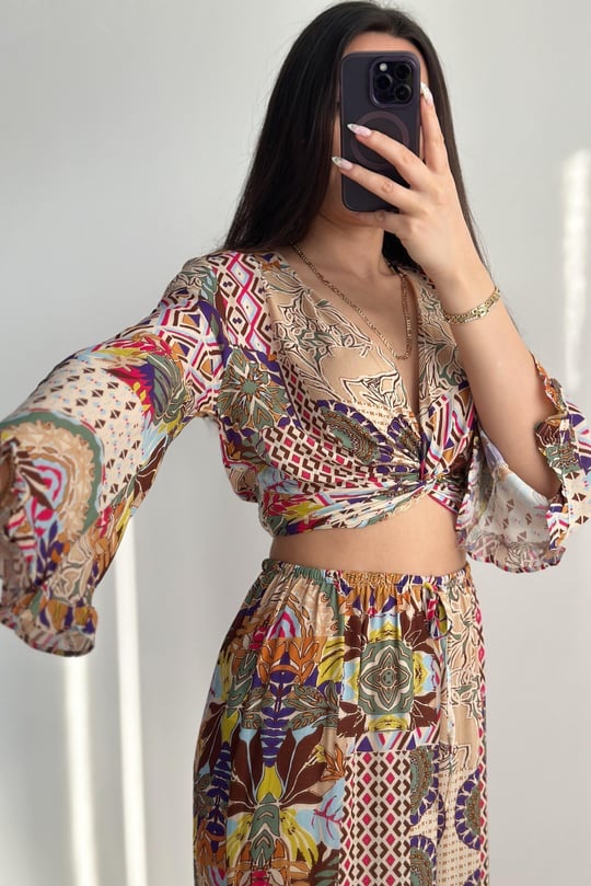 Make a statement this summer in our vibrant Boho Mosaic Set — a lightweight two-piece featuring a twist-front crop top with flowy sleeves and high-waisted wide-leg pants. The bold patchwork print brings together earthy tones, florals, and geometric patterns for the ultimate free-spirited vibe.