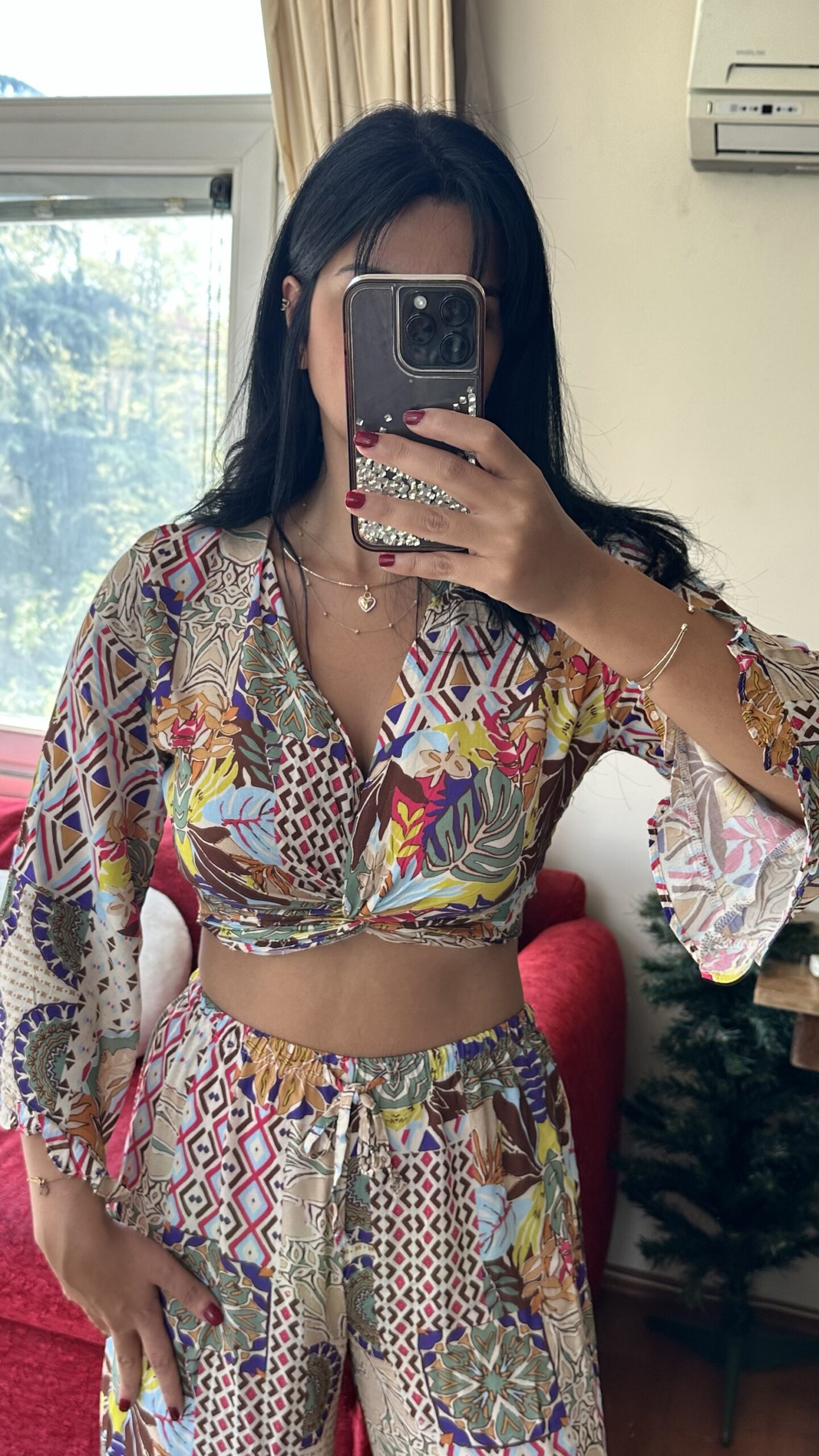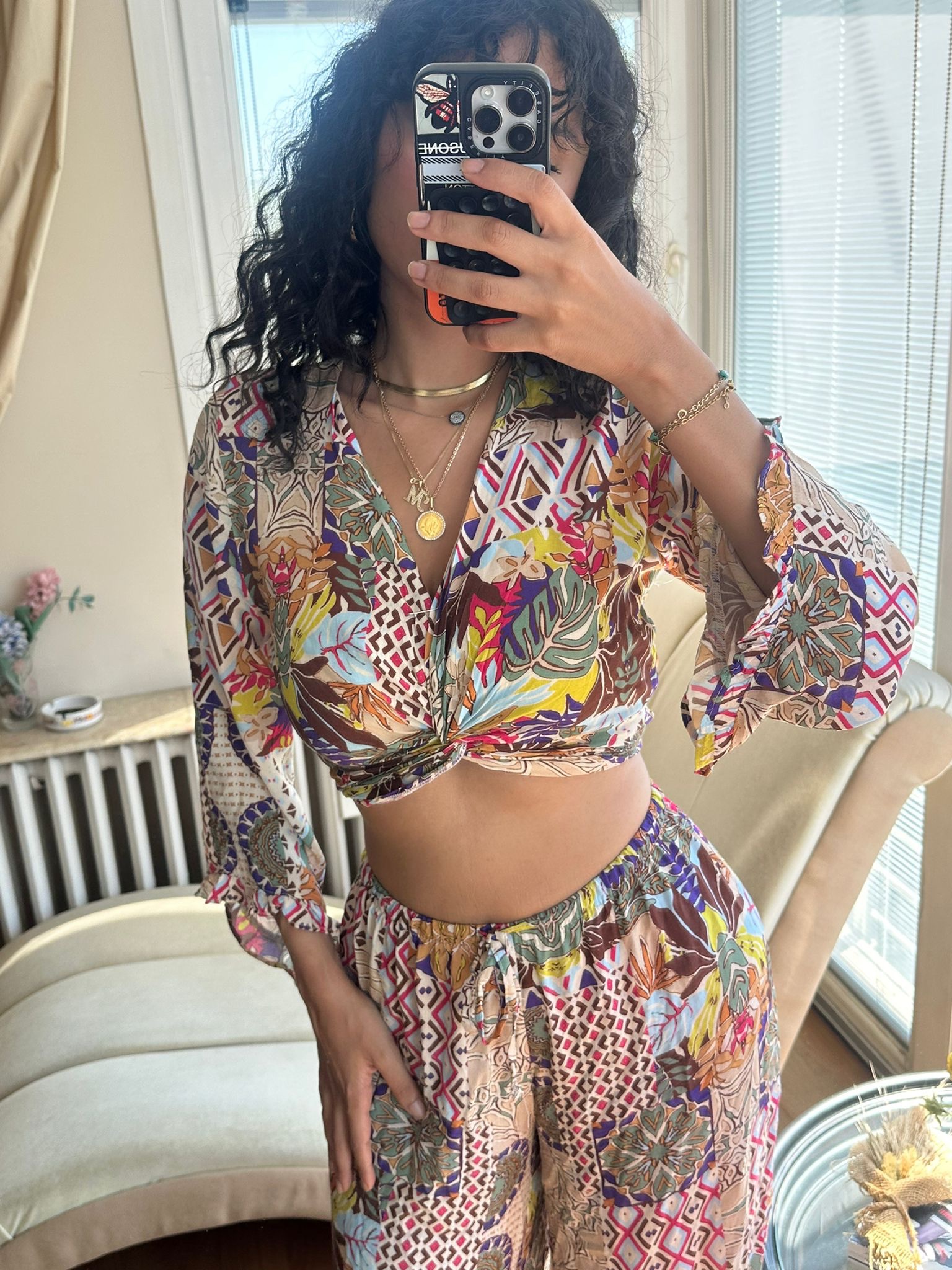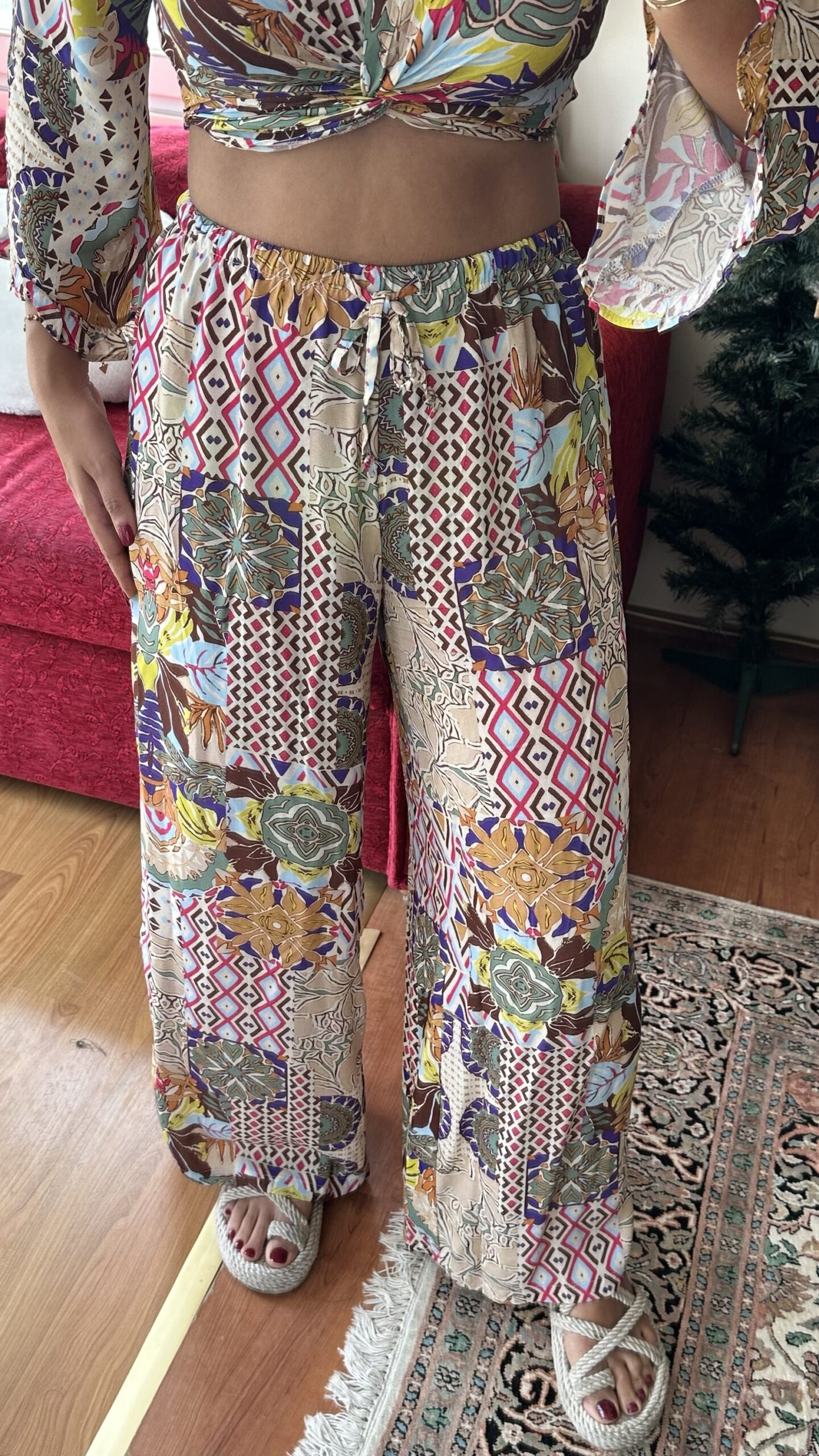 Make a statement this summer in our vibrant Boho Mosaic Set — a lightweight two-piece featuring a twist-front crop top with flowy sleeves and high-waisted wide-leg pants. The bold patchwork print brings together earthy tones, florals, and geometric patterns for the ultimate free-spirited vibe.