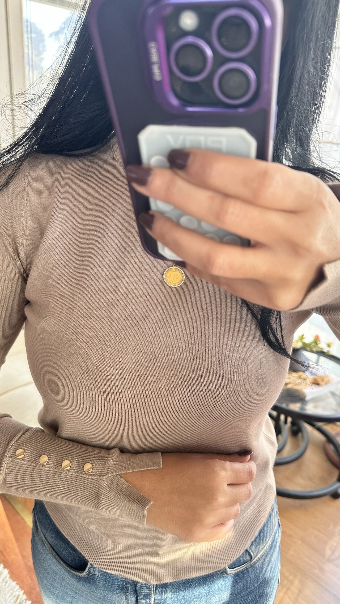 Featuring refined gold button details on the sleeves and a classic high neckline, this piece adds a subtle statement without overpowering your outfit. Whether you’re styling it for work, coffee runs, or layered winter looks, it’s a wardrobe essential you’ll reach for every day.