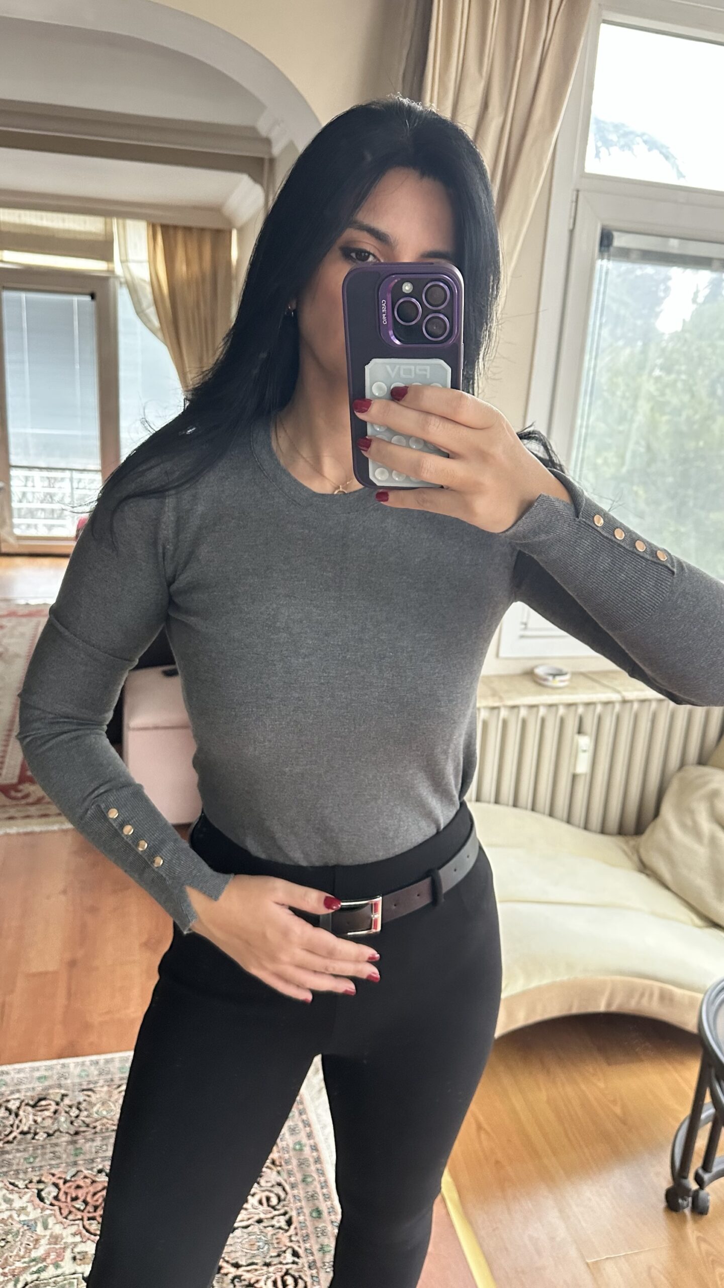 Featuring refined gold button details on the sleeves and a classic high neckline, this piece adds a subtle statement without overpowering your outfit. Whether you’re styling it for work, coffee runs, or layered winter looks, it’s a wardrobe essential you’ll reach for every day.