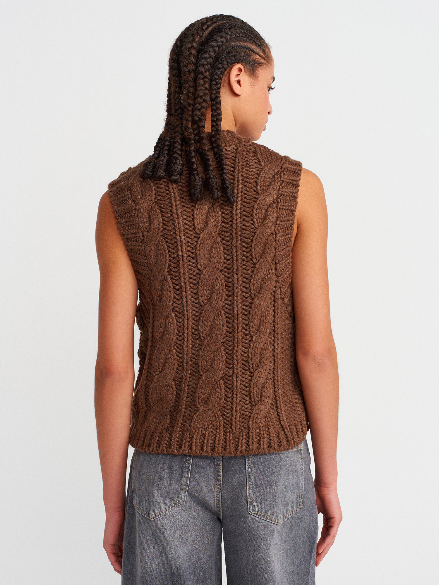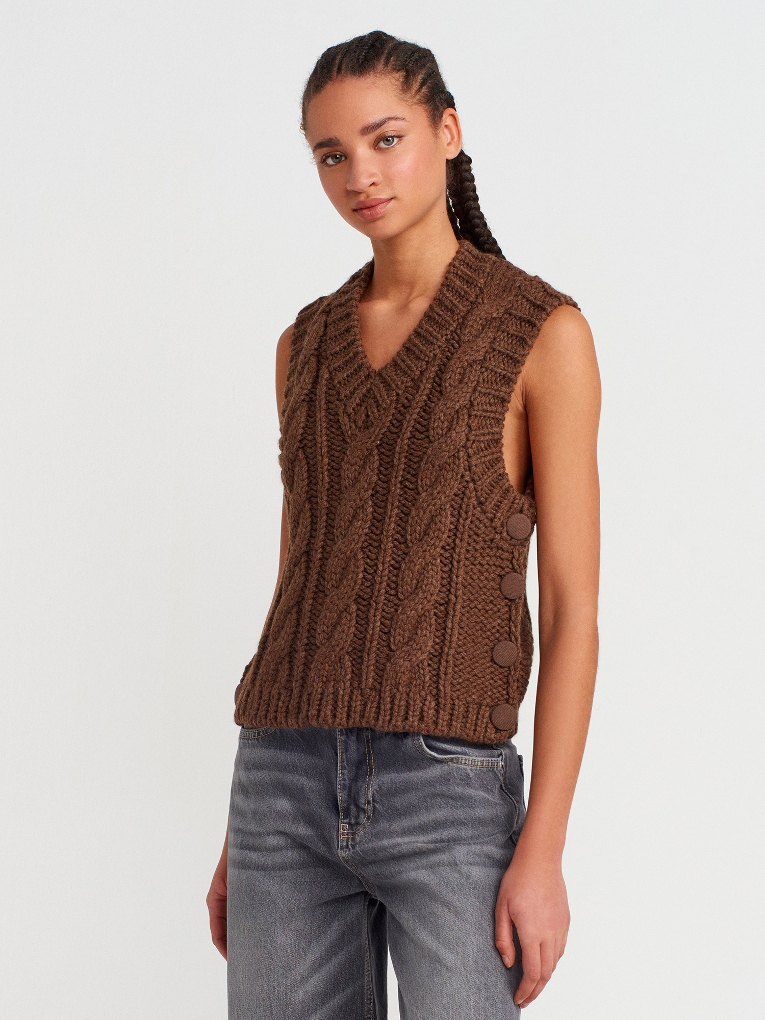 Designed with a deep V-neckline and chunky braided knit, this sleeveless sweater is the perfect layering piece for jeans, shirts, or long-sleeve basics. The side button details add a modern twist that elevates even the simplest outfit.