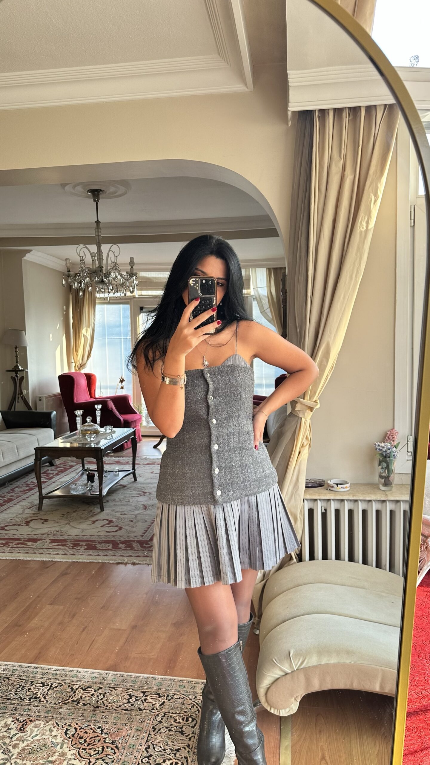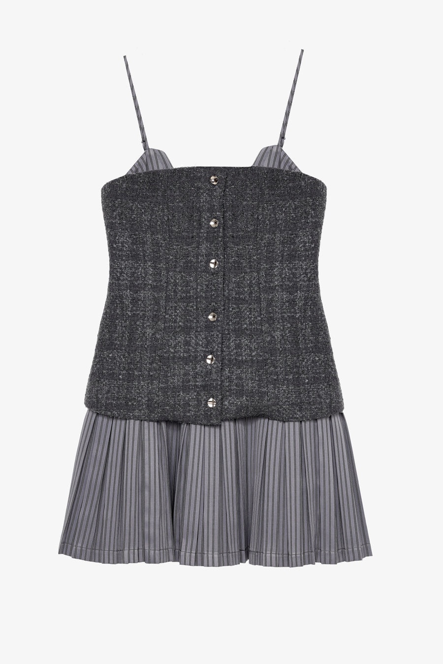Meet your new statement dress for winter — the Grey Tweed Corset Pleated Mini Dress, a chic two-in-one silhouette that blends a structured tweed bustier with a soft, flowing pleated mini skirt.