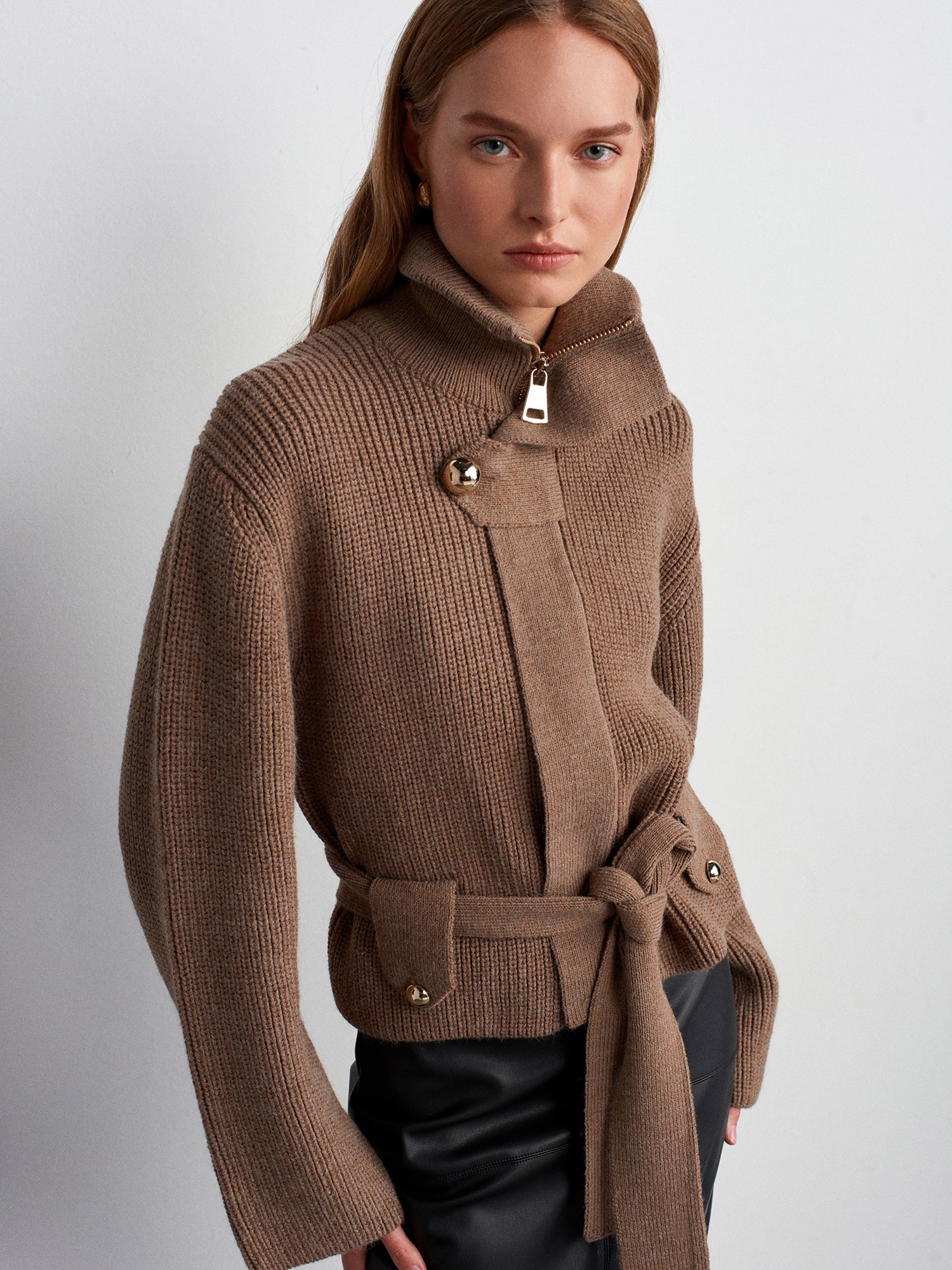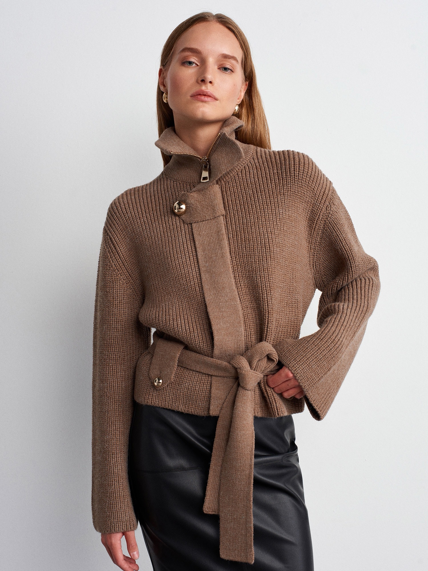 The Ivory Wrap Knit Jacket is crafted from a soft, textured knit with a structured yet relaxed silhouette. Designed with a wrap belt to cinch the waist and subtle gold-tone button details, this piece elevates any everyday look with minimal effort.