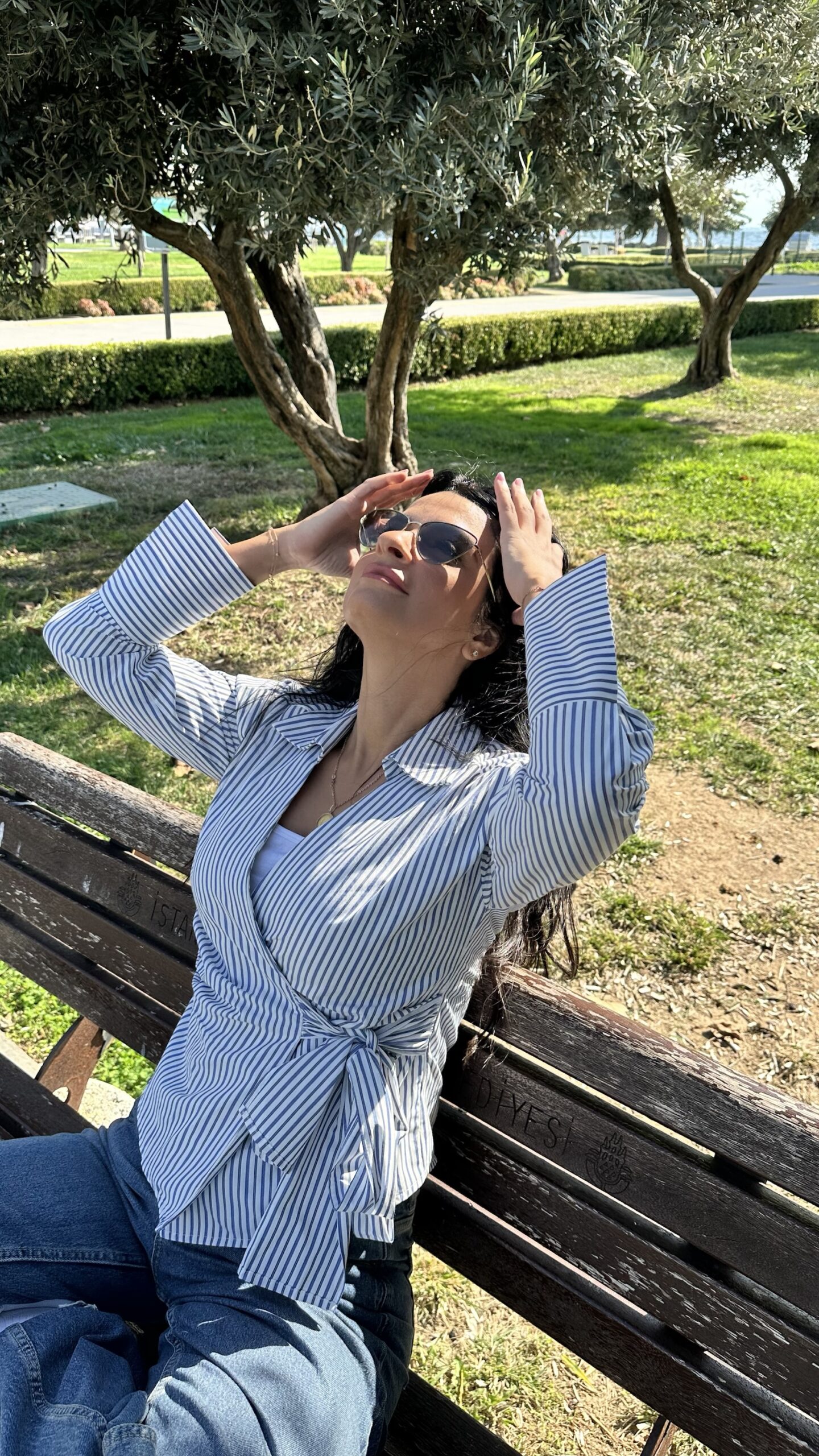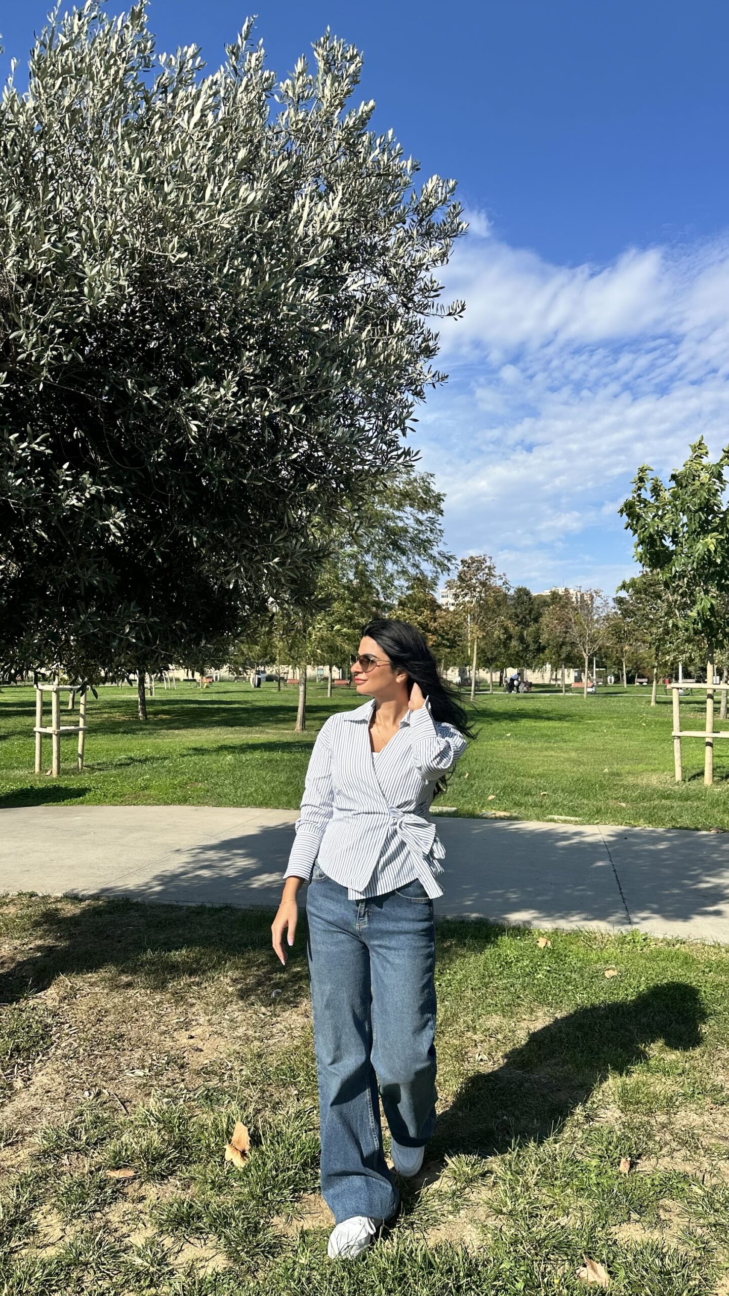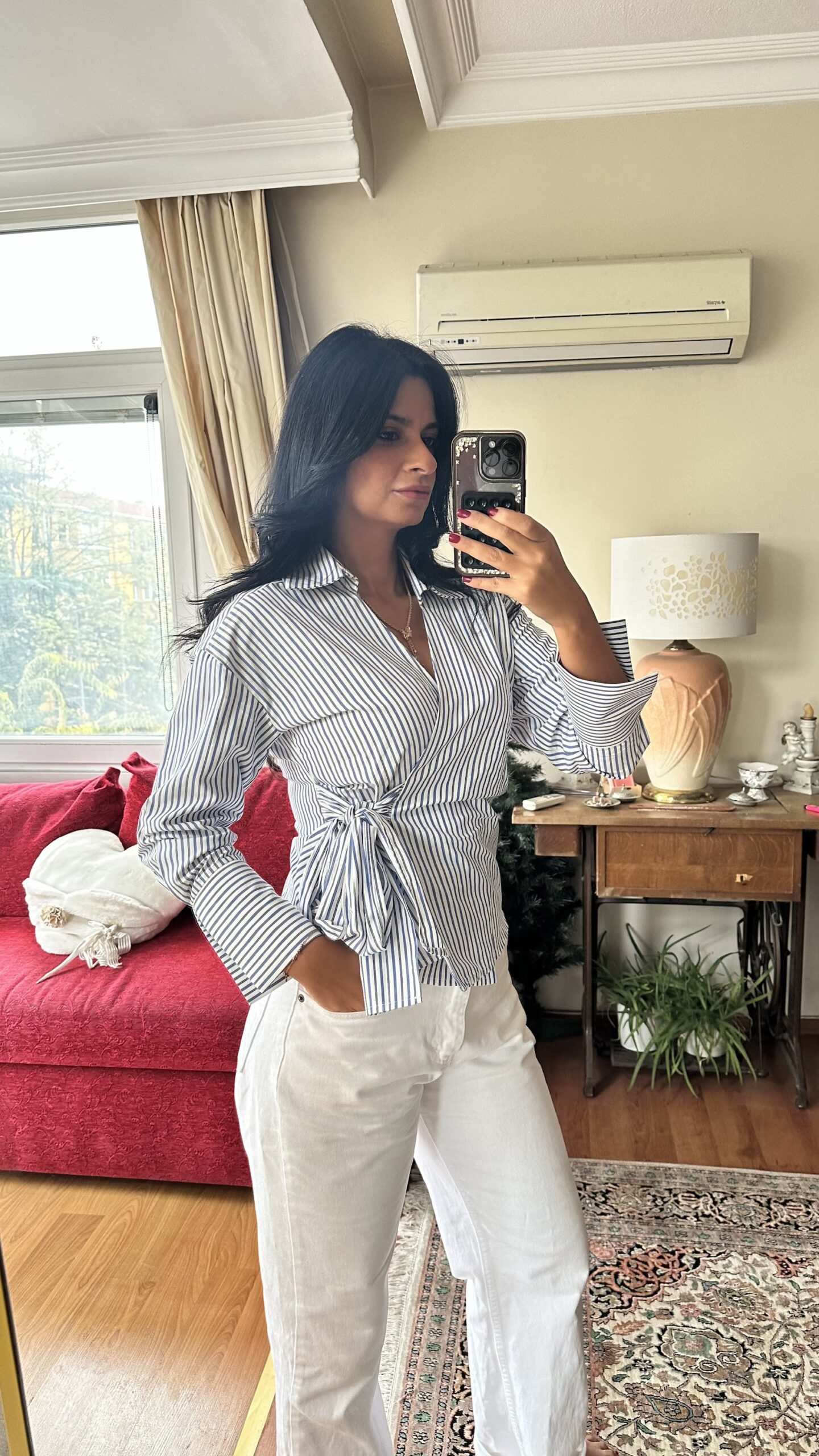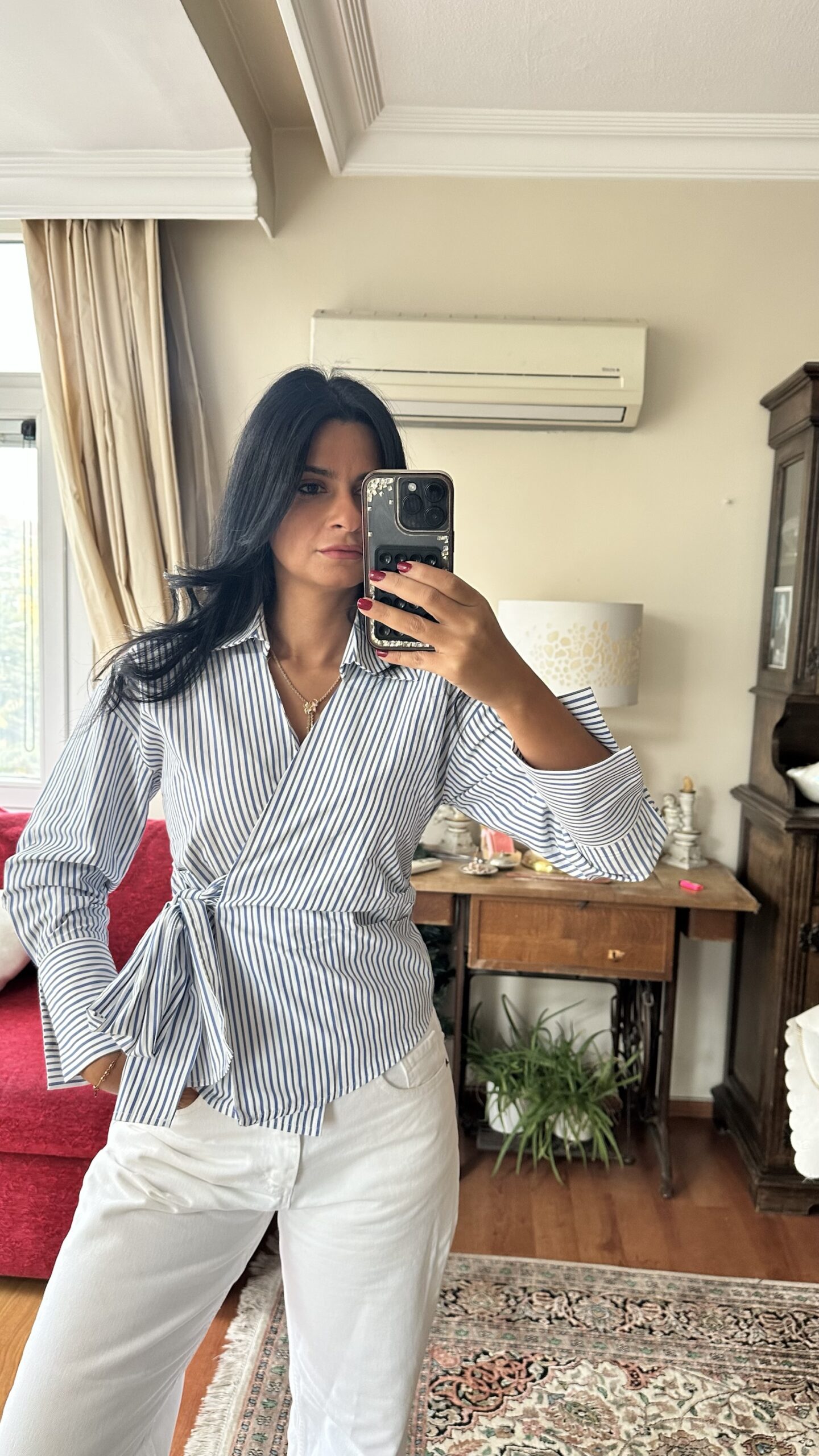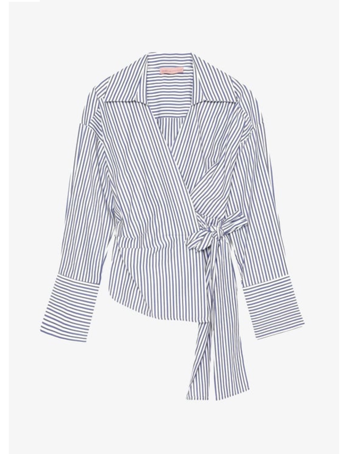 Made from soft cotton shirt fabric with clean navy pinstripes, it wraps at the waist with a side tie for a flattering, adjustable fit. The collared neckline and wide cuffs give it a sharp, tailored look, while the wrap design keeps it feminine and easy to style. Pair it with jeans for casual chic, or with tailored trousers and boots for a polished fall outfit.