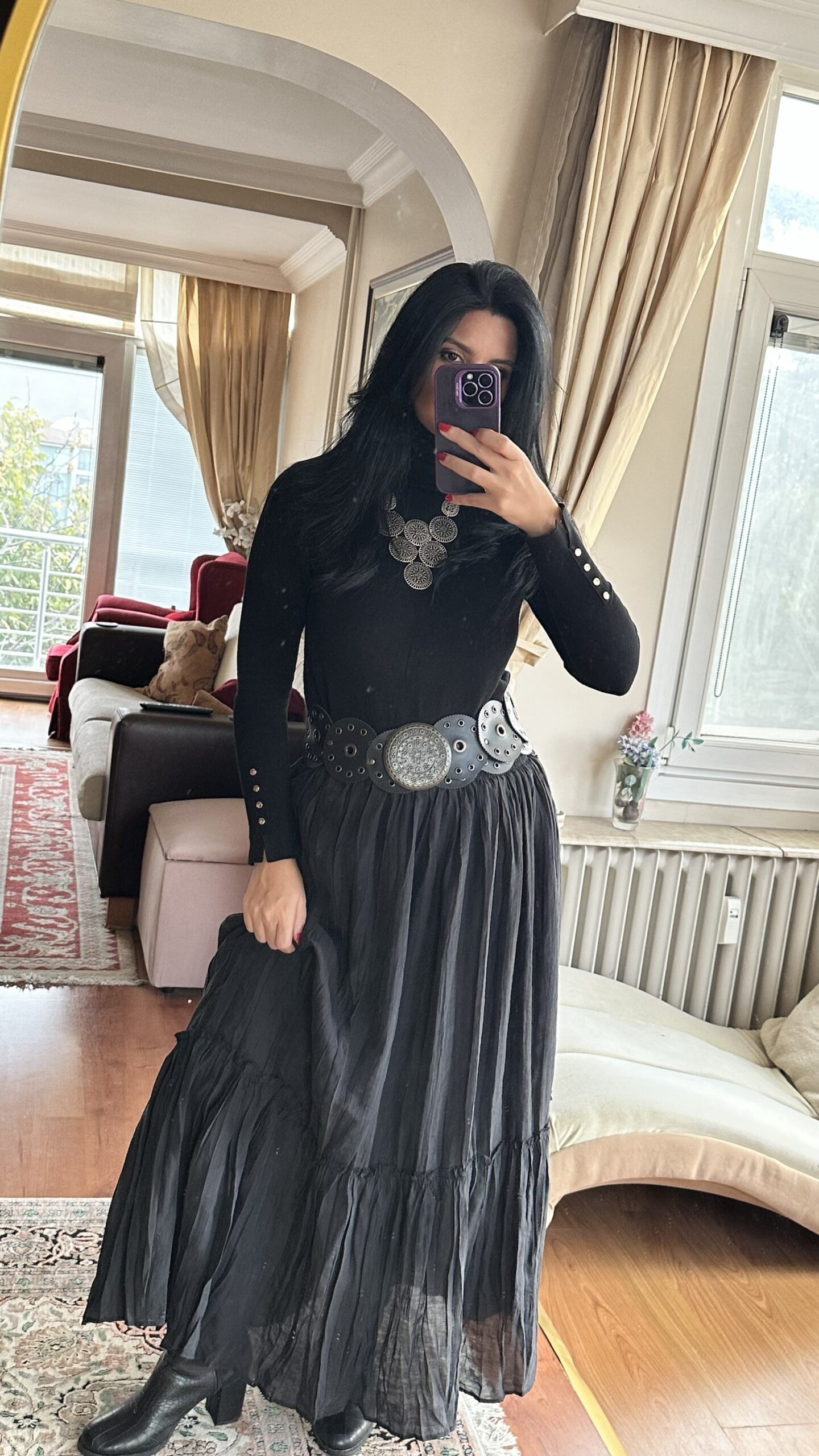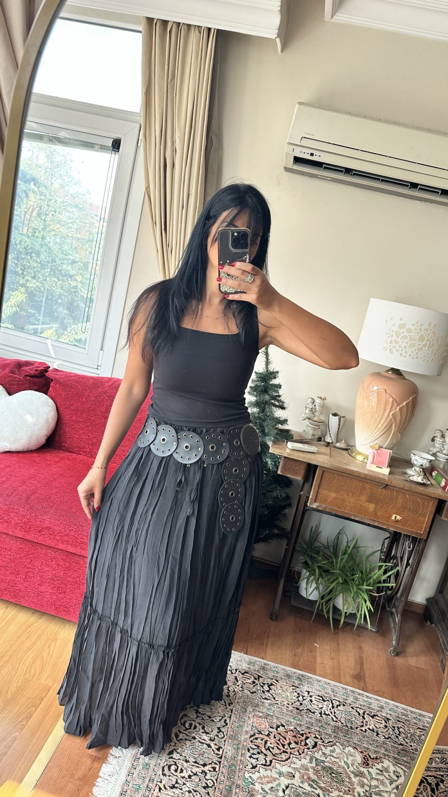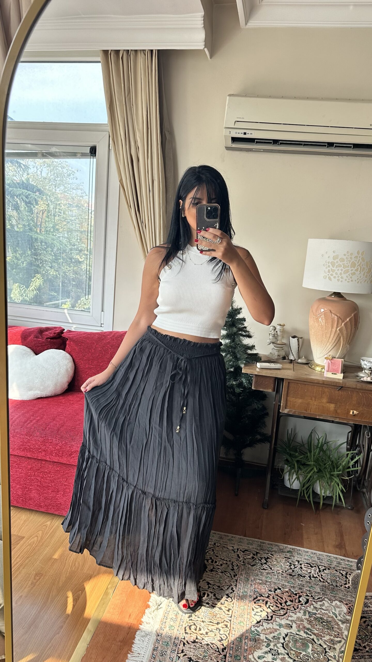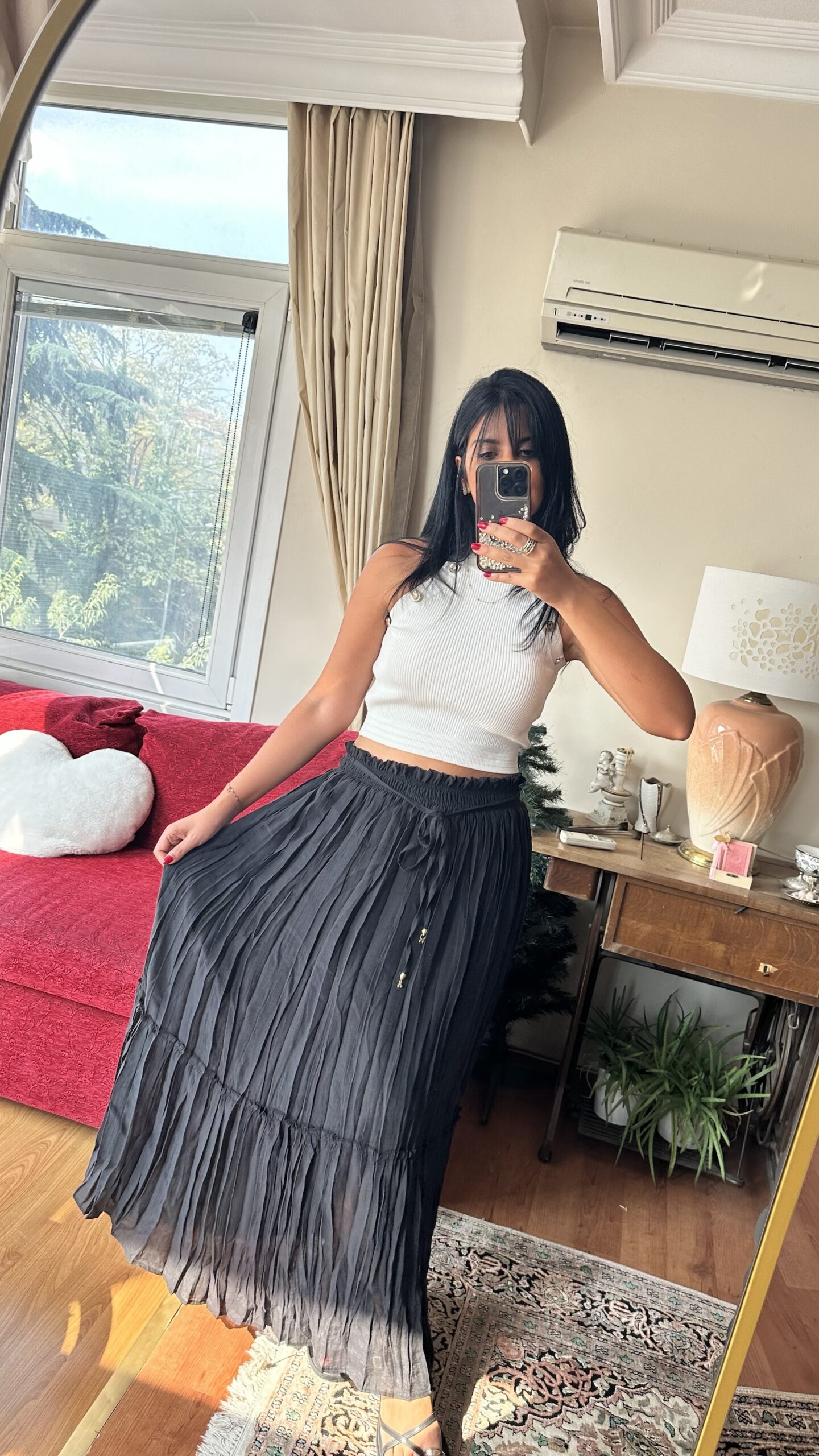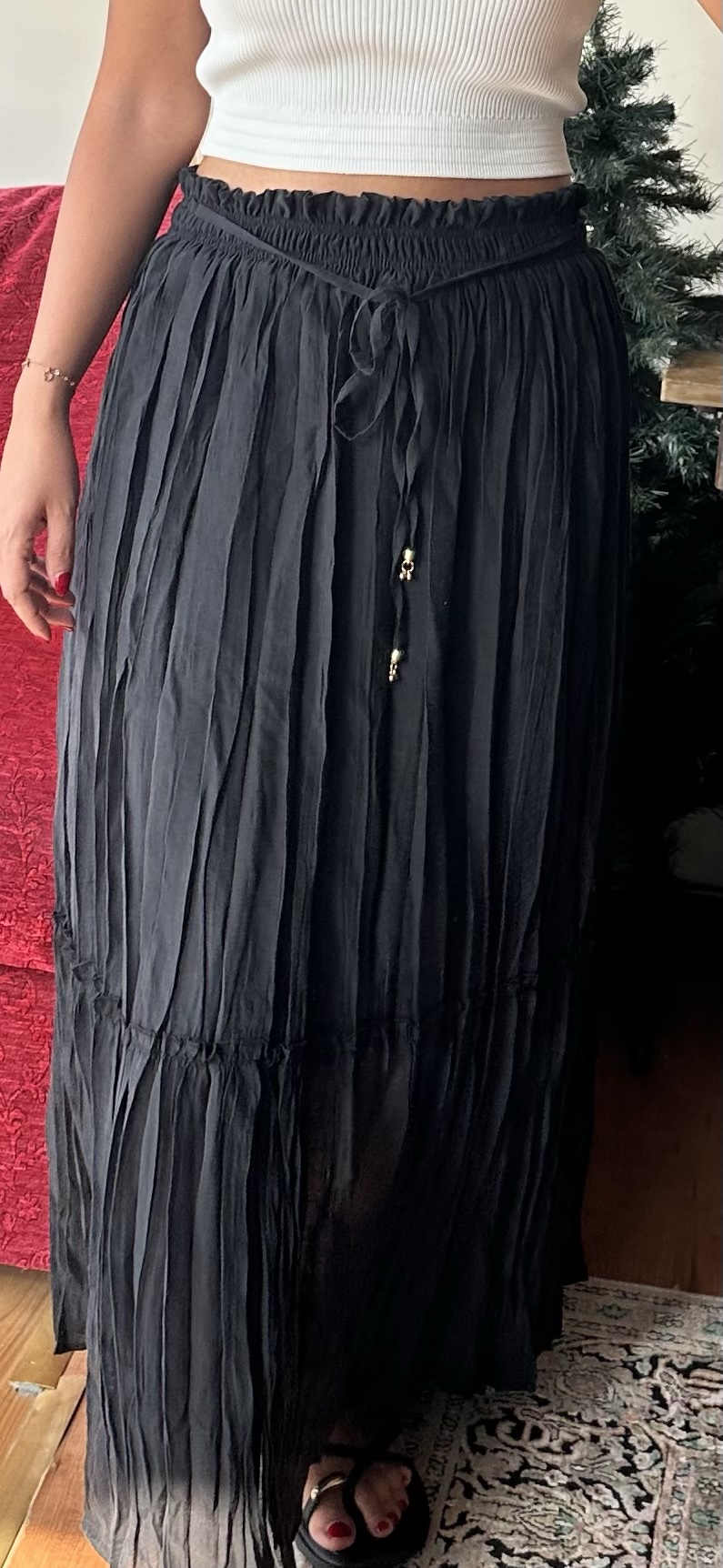This flowing black maxi skirt is made from feather-light crinkled fabric and features an elastic waistband with tassel-tie detail. One size fits comfortably from XS to L. Whether it’s a sunset dinner or a city stroll — this piece moves with you.