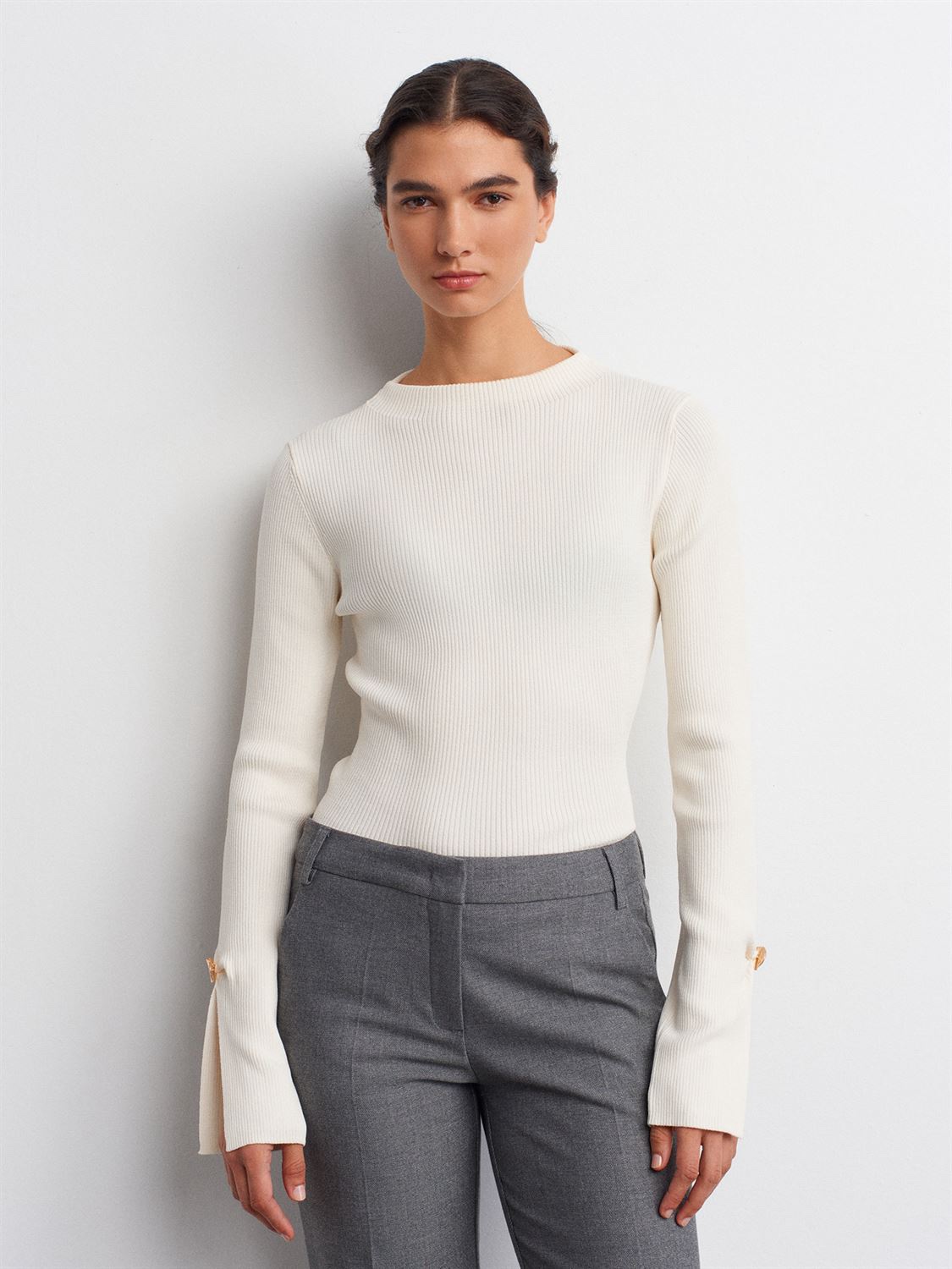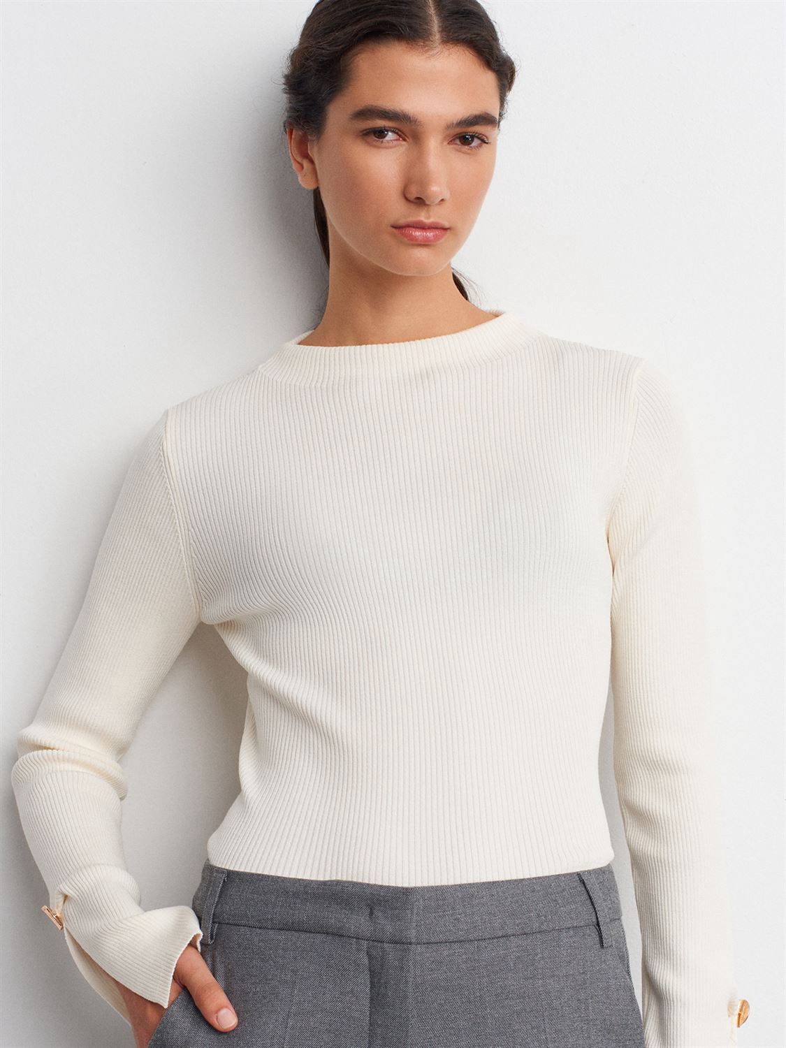 Crafted from a premium ribbed fabric with a flattering slim fit, this piece features signature gold button cuffs and a chic minimal silhouette that elevates any look.
