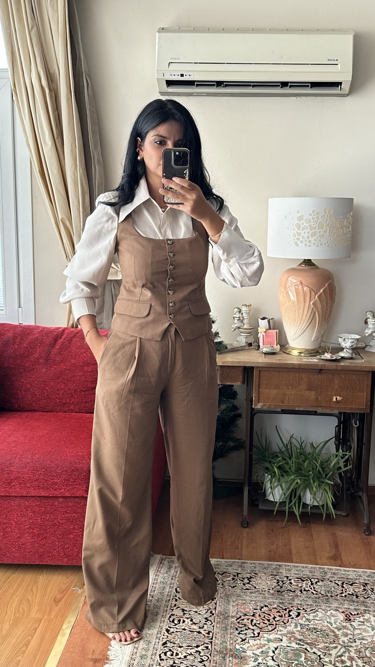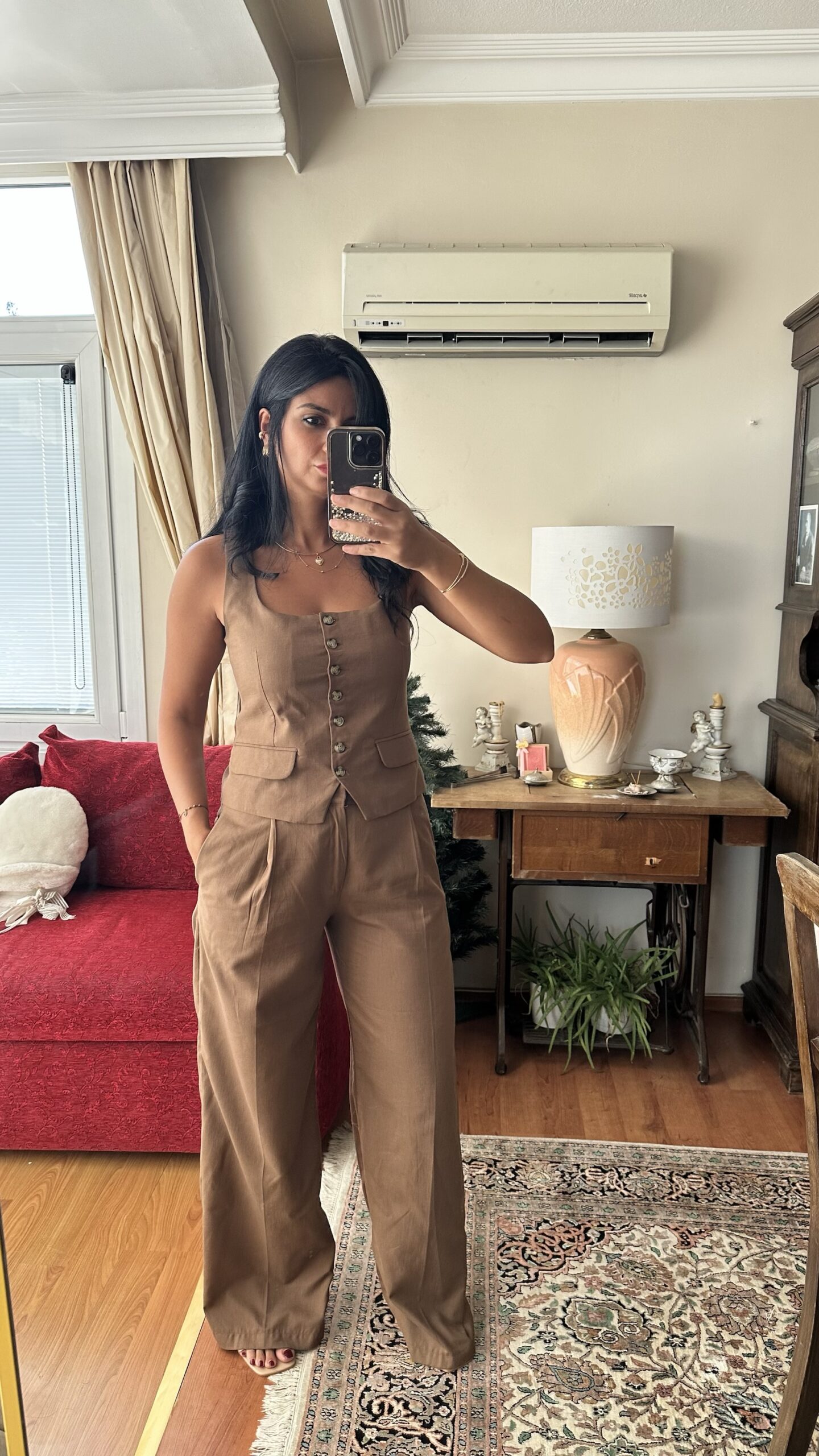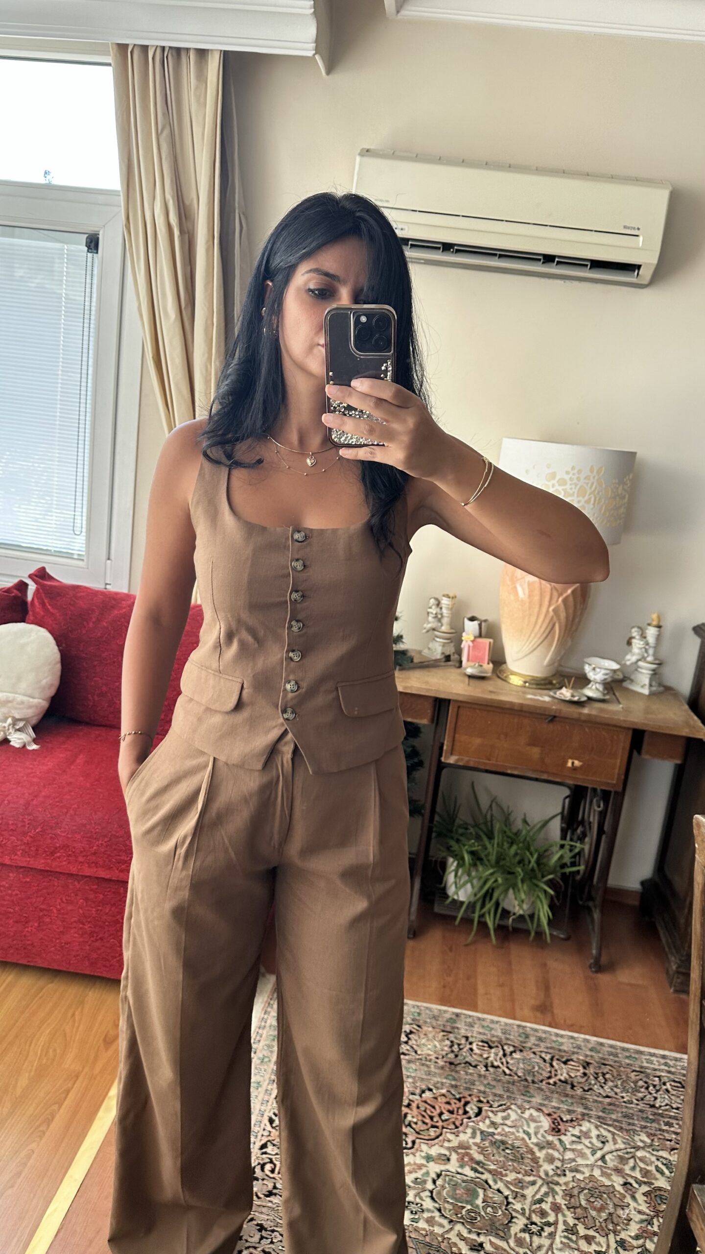 Featuring a tailored vest with button details and wide-leg pants for a sleek, modern silhouette.