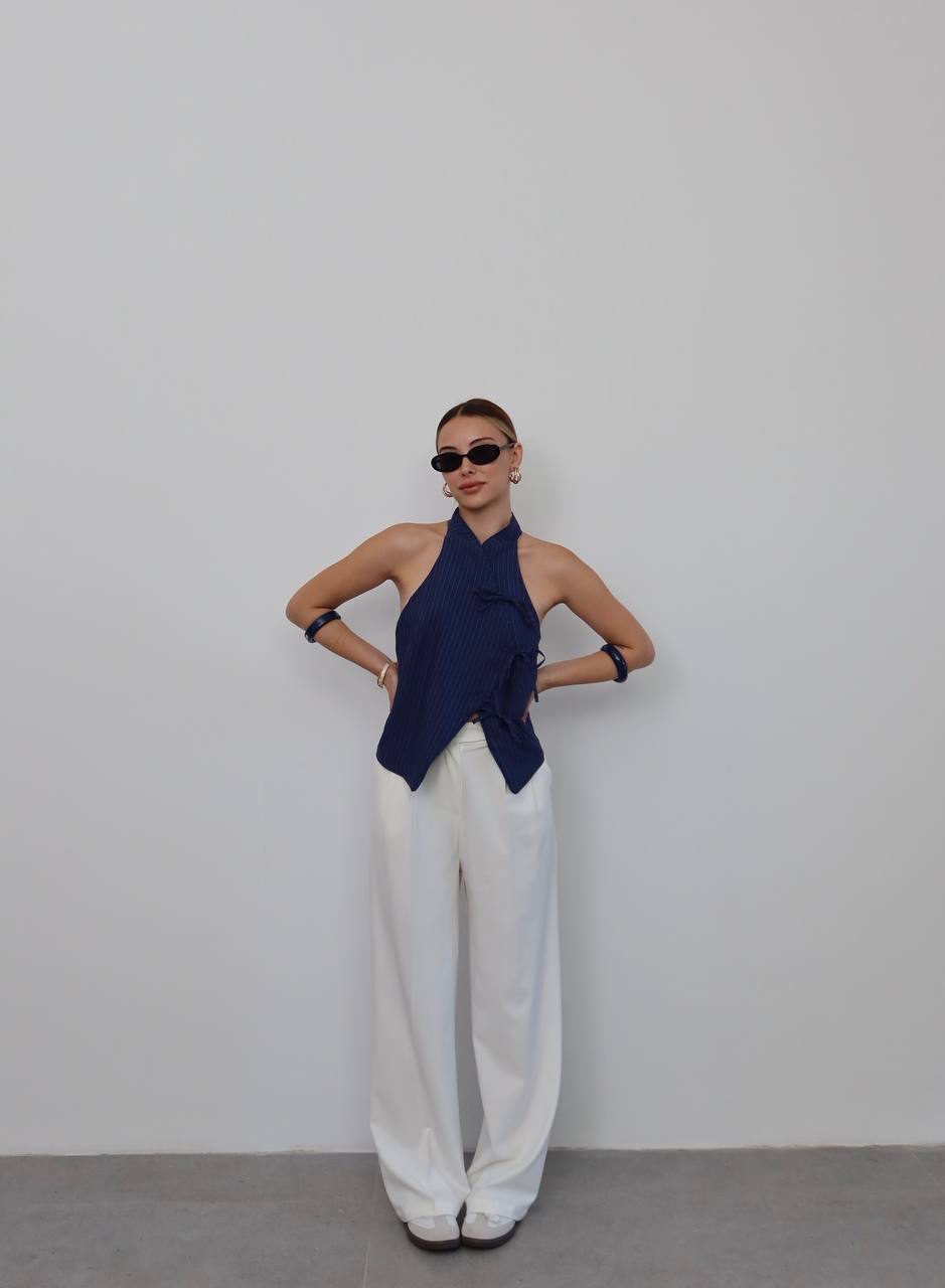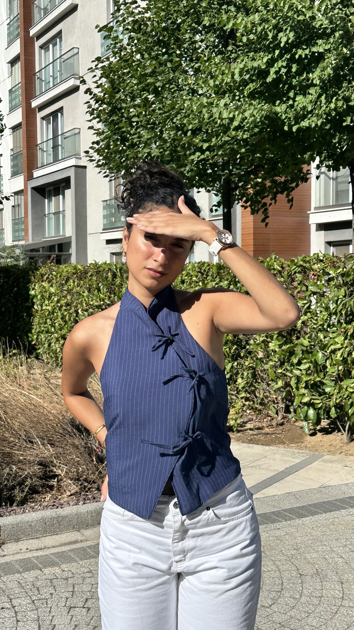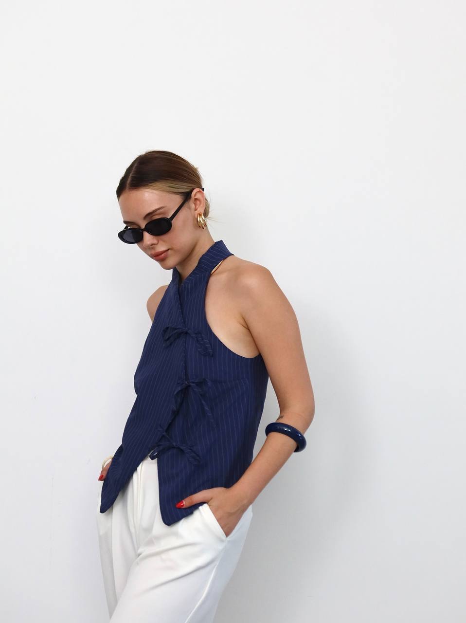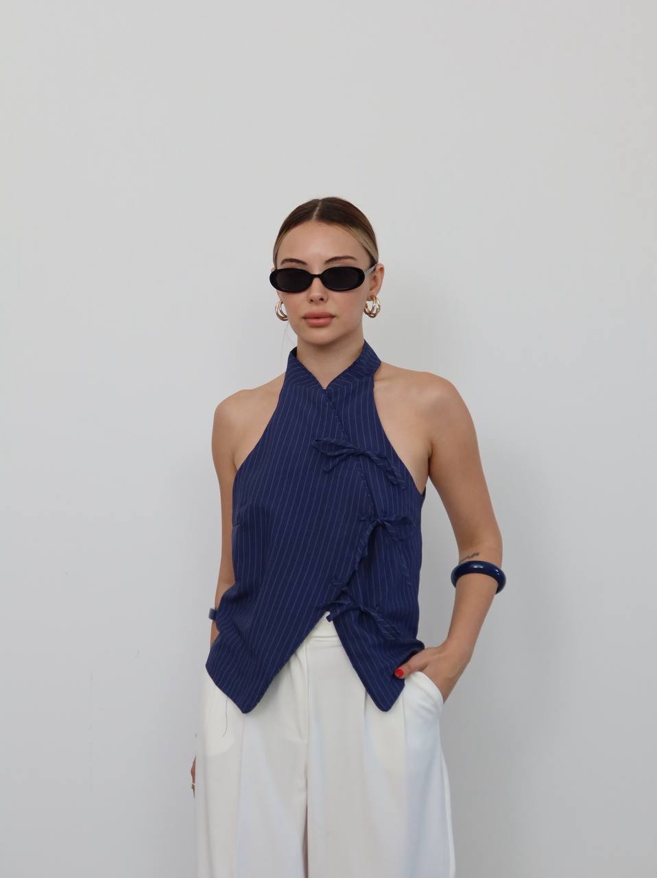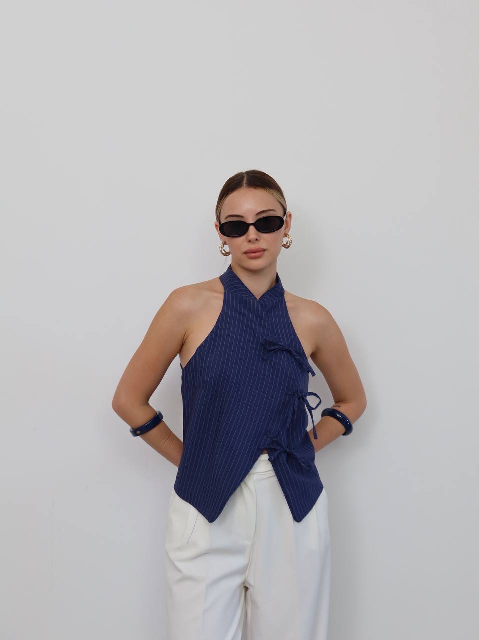 A modern twist on timeless tailoring — the Navy Knot Mandarin Top blends pinstriped structure with delicate side knot ties for a chic and refined finish. Featuring a halter mandarin neckline and asymmetric hem, this top brings effortless polish to any look.