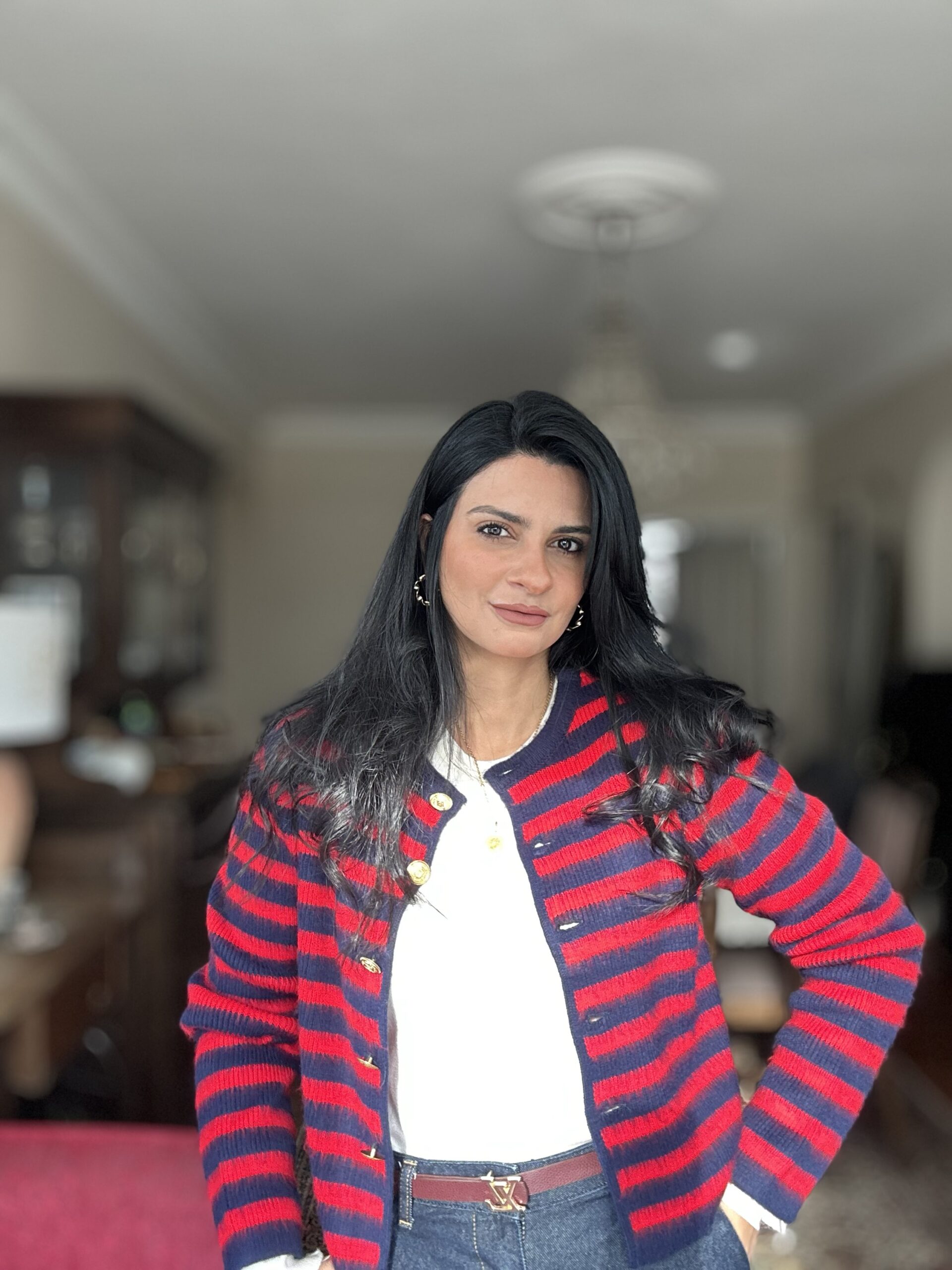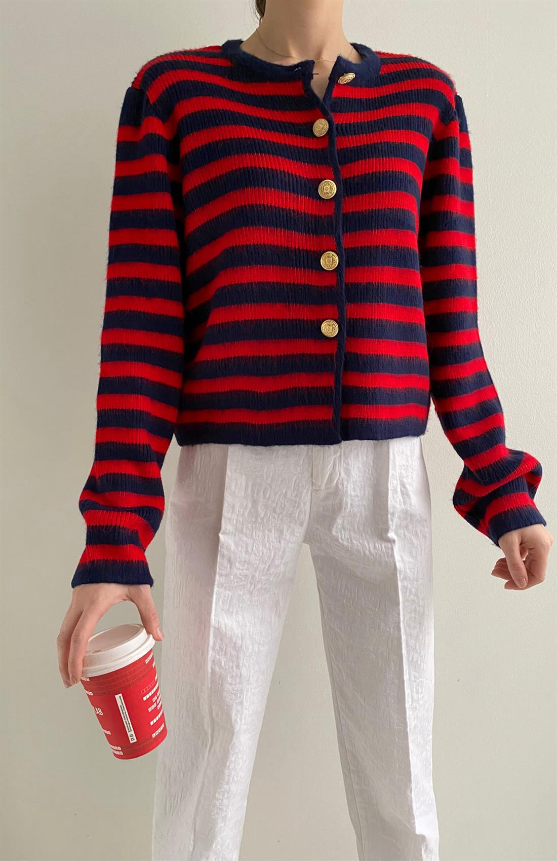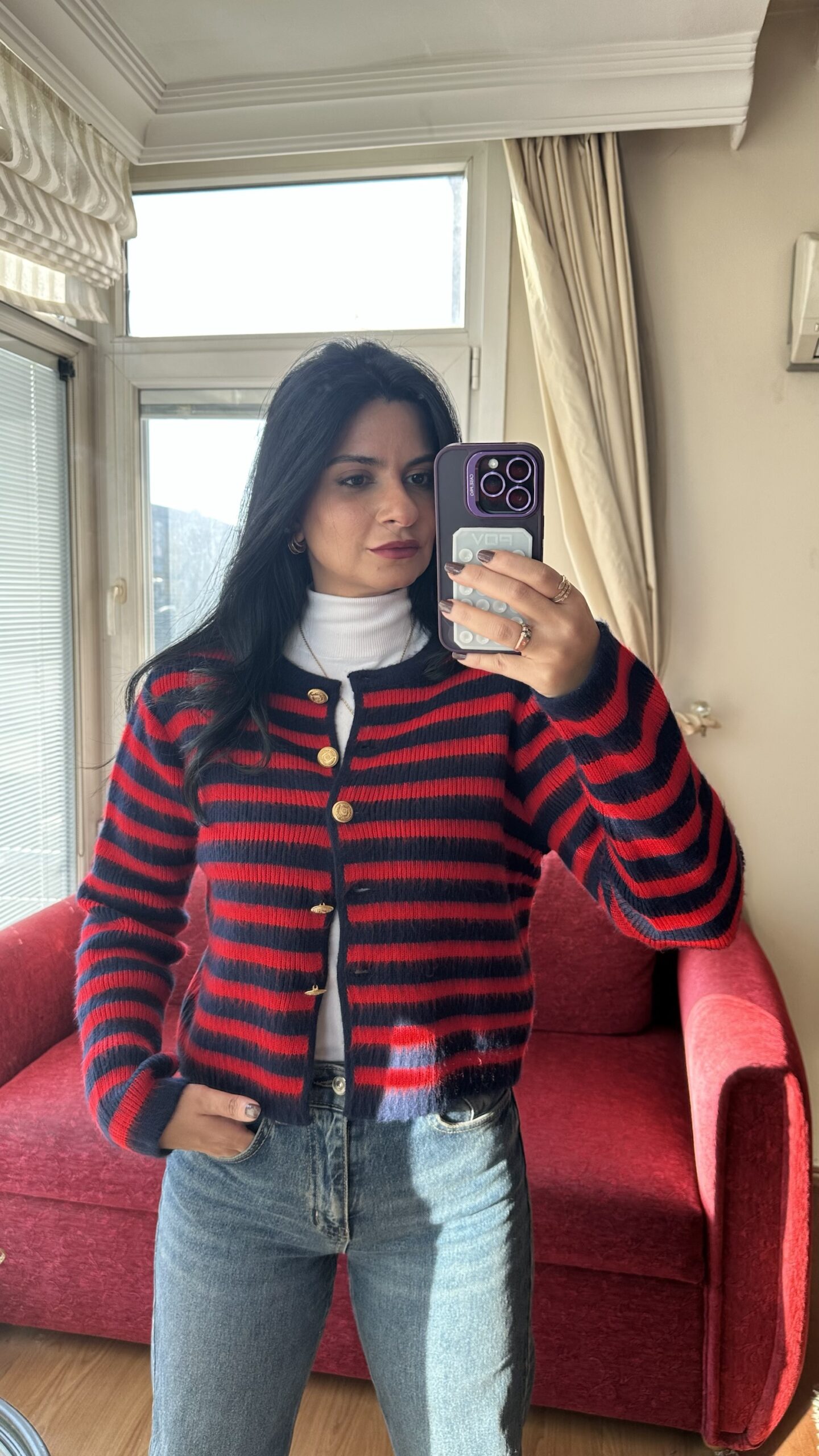 The Navy Rouge Striped Knit Cardigan brings the perfect mix of bold chic and effortless comfort. Designed in soft knit with red & navy stripes and finished with gold button details to elevate any basic look.