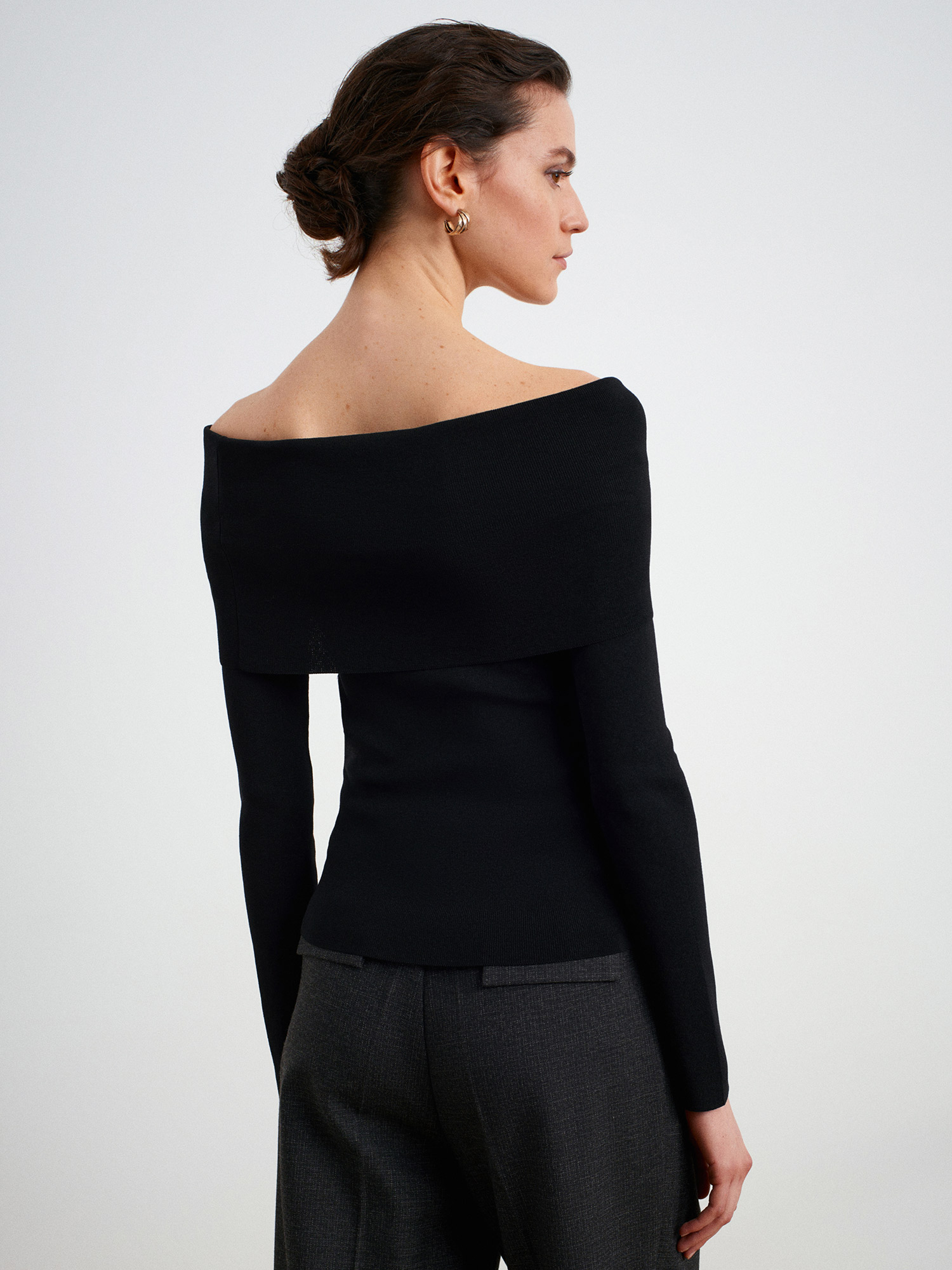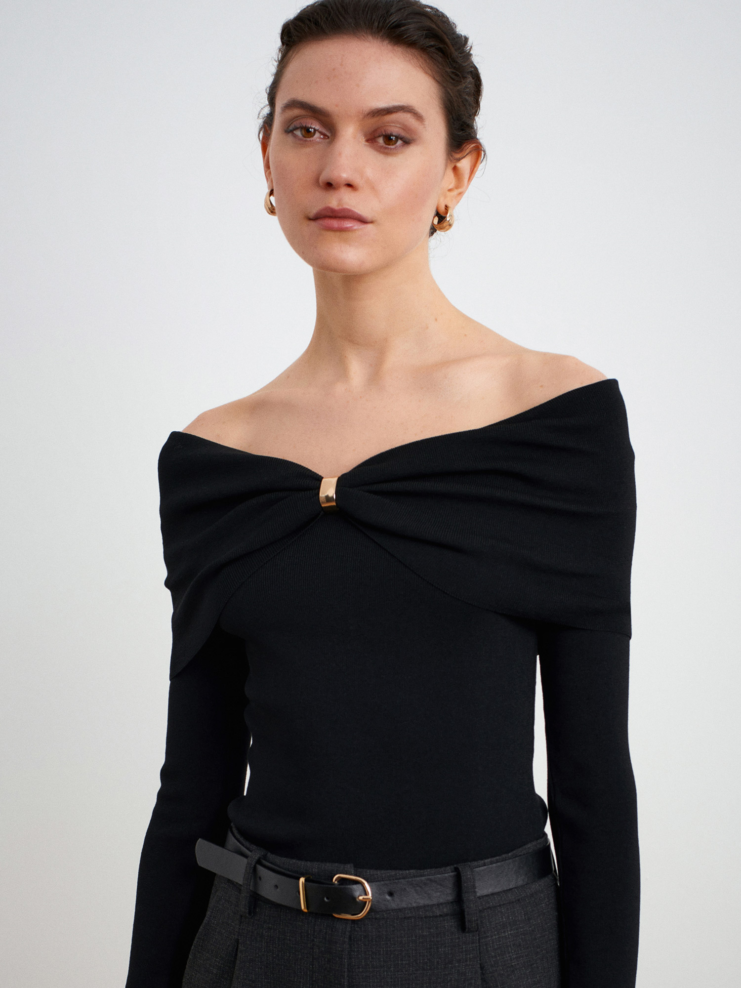 This black off-shoulder top features a soft draped neckline with a delicate knot detail that adds a feminine, elevated touch.