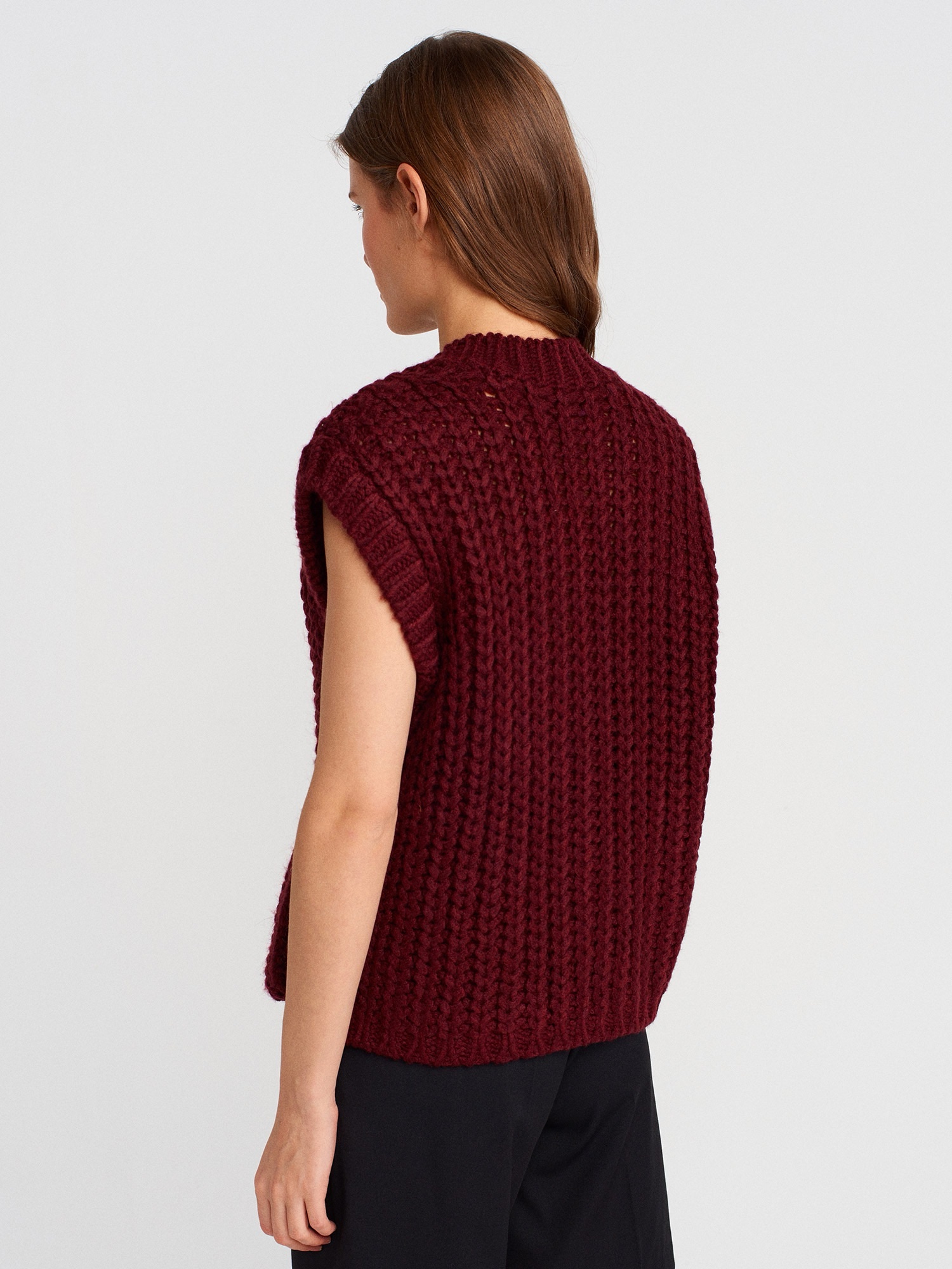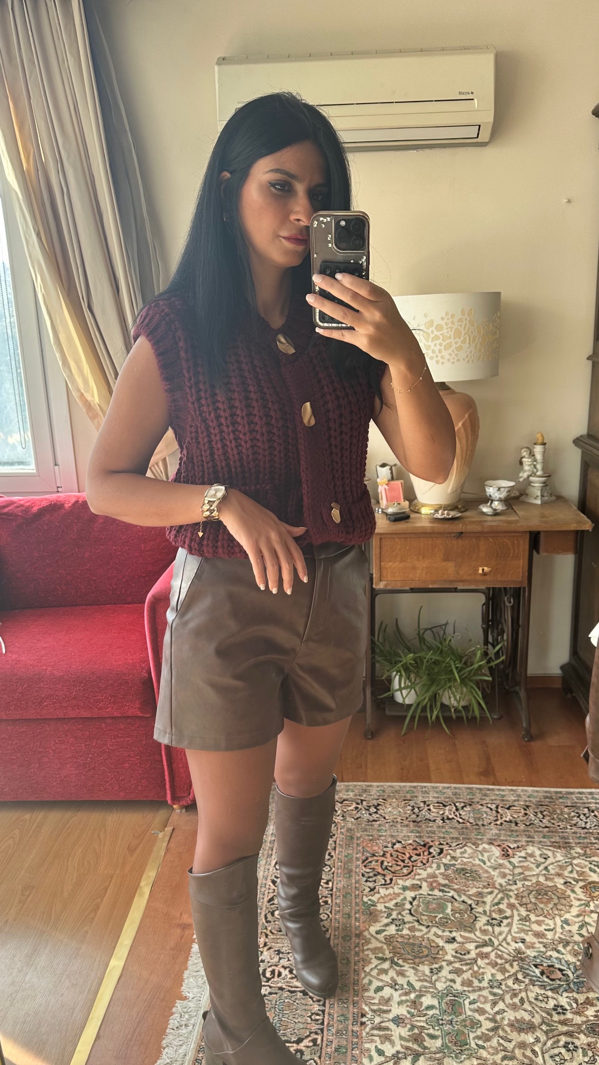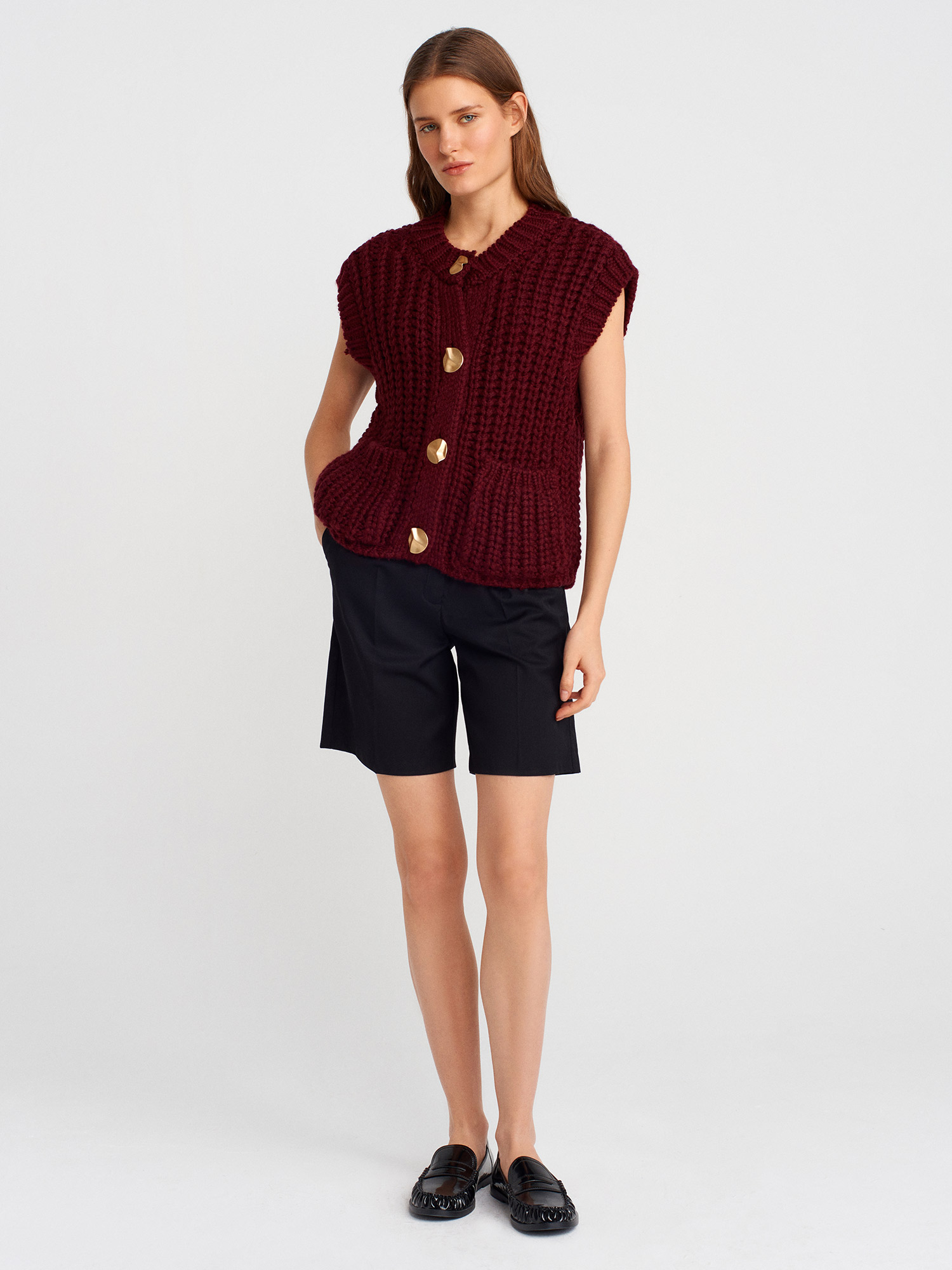 Crafted in a rich burgundy hue with a chunky, soft textured knit, this vest brings warmth, structure, and a touch of luxury to any outfit. The statement gold buttons and front pockets add a refined, modern look that makes it stand out from classic knitwear.