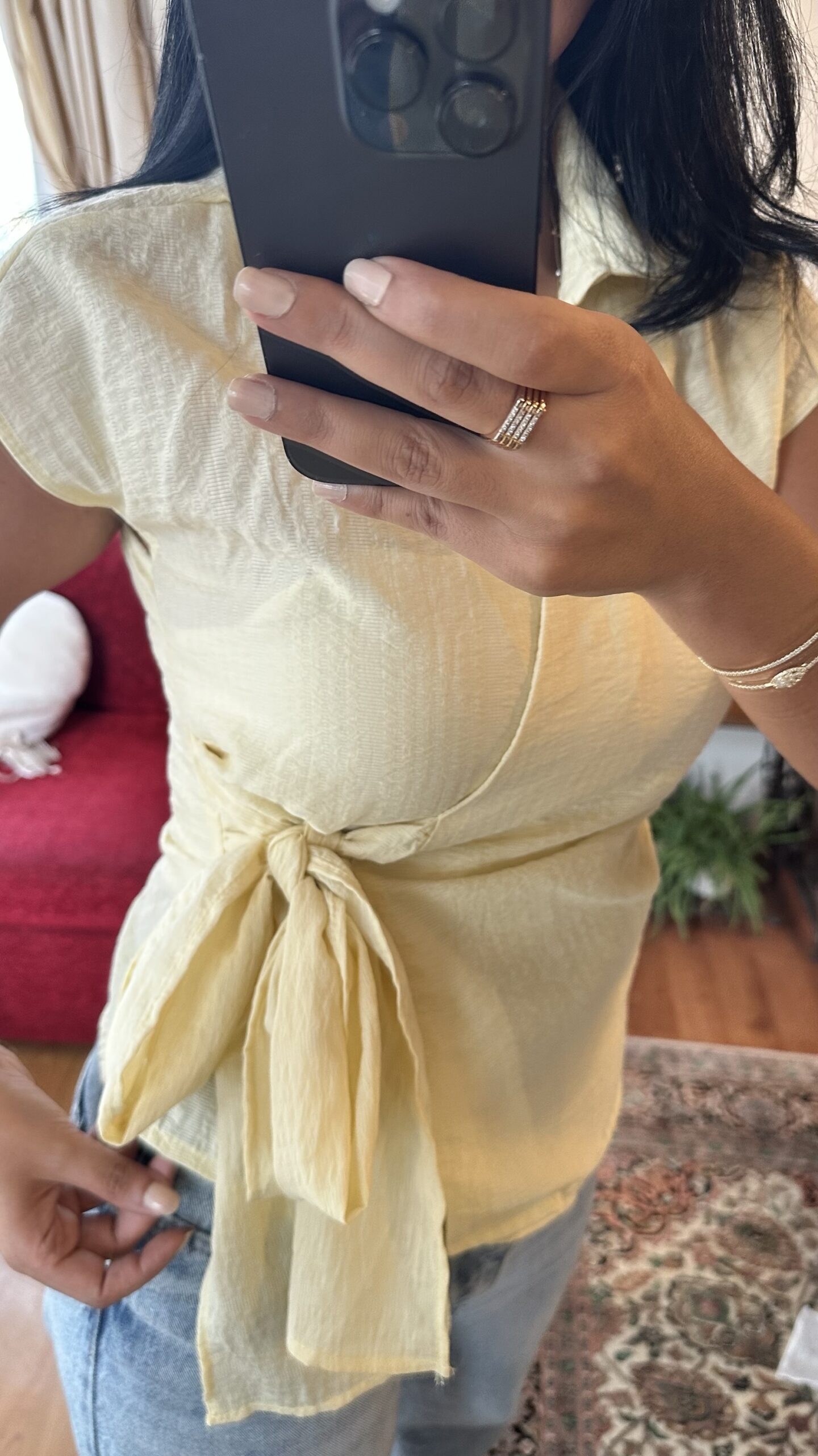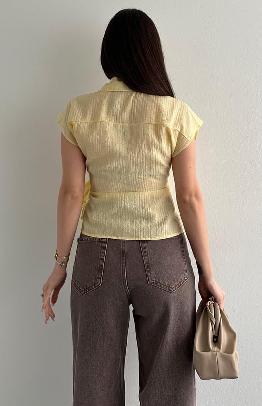 Elevate your everyday style with our Serenity Wrap Top – a lightweight, textured blouse featuring a flattering wrap design and an oversized bow tie at the waist. The short sleeves and soft collar add a touch of effortless polish, perfect for casual days or dressed-up evenings. Available in crisp white and soft lemon yellow for a fresh, breezy summer vibe.