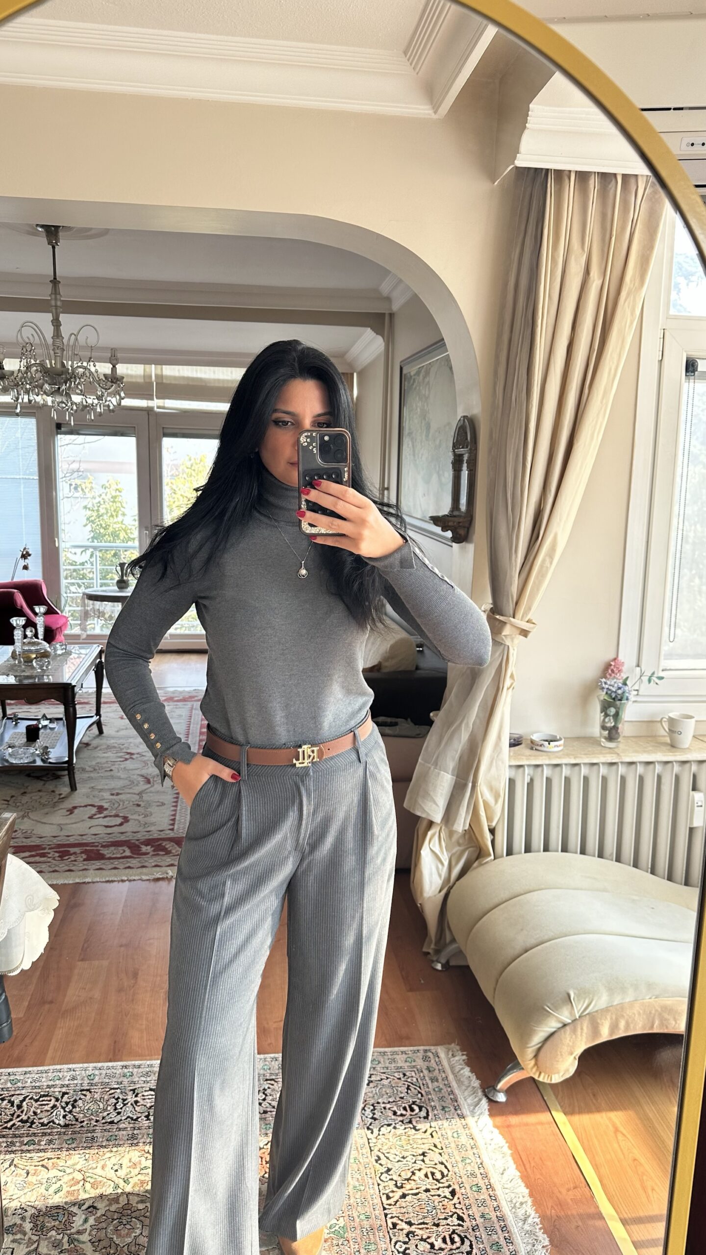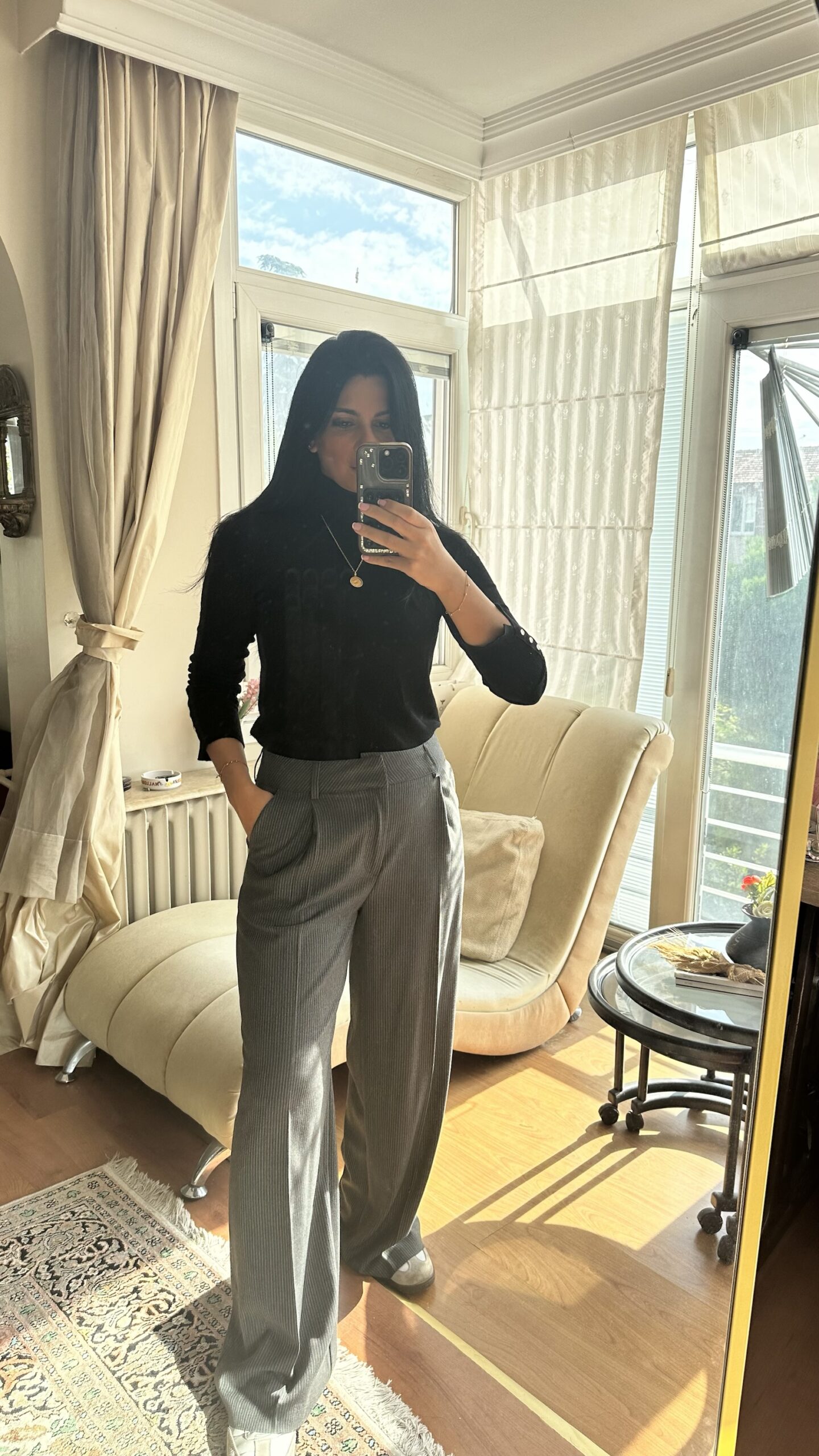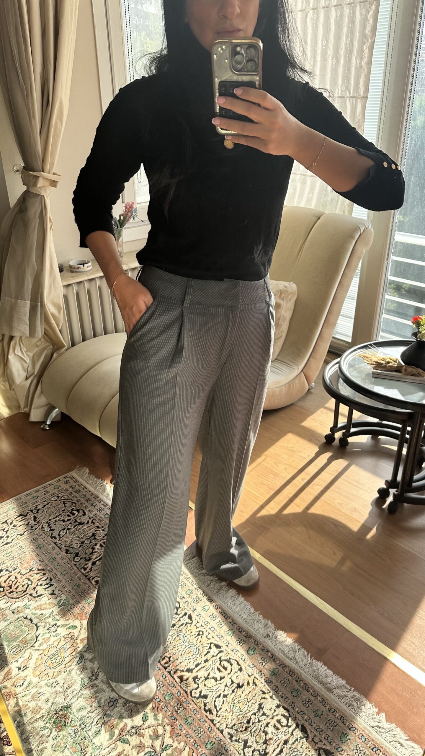 These pinstripe wide-leg pants are where comfort meets sophistication. Designed with a structured high waist and soft flowing legs, they offer a perfect balance between tailored elegance and casual ease.